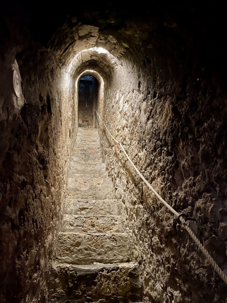 Aukion laidalla on suuri kellotorni ja aukiolle kuljetaan muurien reunustamaa kujaa holvikaarien alta. Aukion toiselta laidalta lähti lyhyt kävelykatu kohti kukkulaa, jonka huipulla on suuri kirkko. Huipulle johtaa katettu portaikko, joka on illalla myös valaistu. Katettu portaikko oli ihan kiva, kun aurinko porotti pilvettömältä taivaalta ja lämmintä oli lähemmäs 30 astetta. Kiertelimme myös hiukan syrjäisempiä kujia, joissa ei ollut juurikaan ihmisiä eikä myyntikojuja. Nämä kujat olivat todella kauniita värikkäine taloineen. Täällä on myös useita houkuttelevia kahviloita kauniine sisutuksineen ja kukkaistutuksineen. Kävimmekin siis juomassa kahvit ja syömässä jätskit.