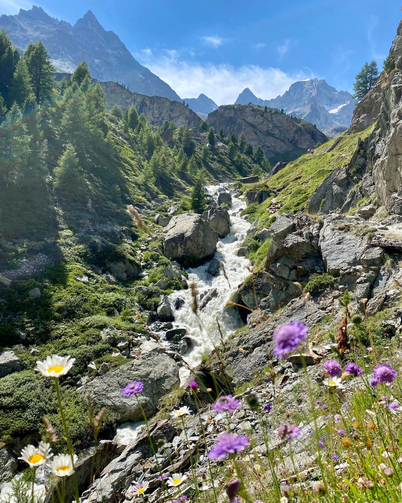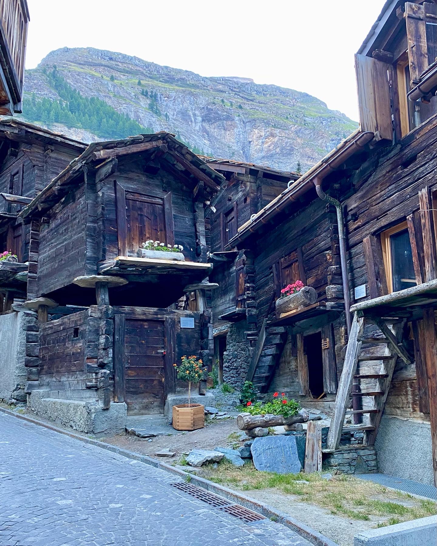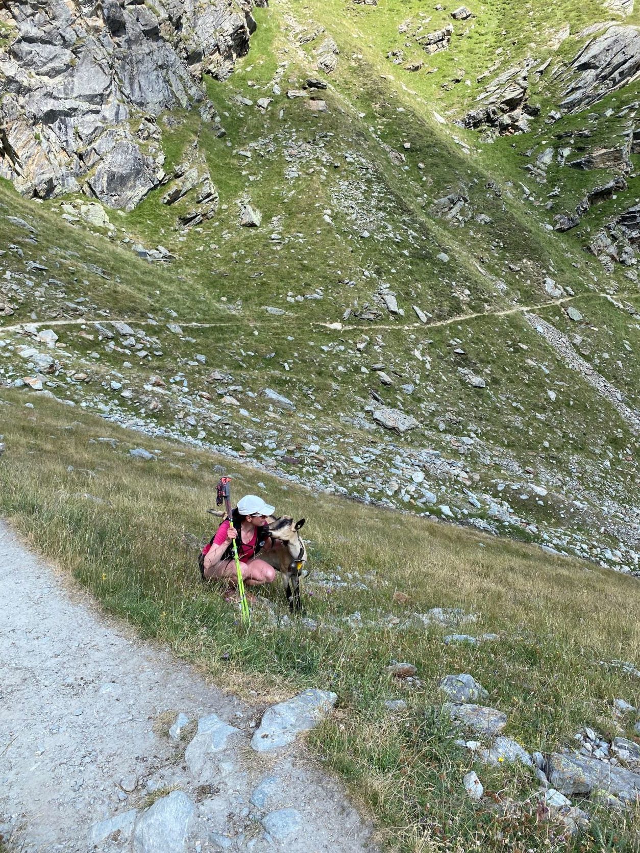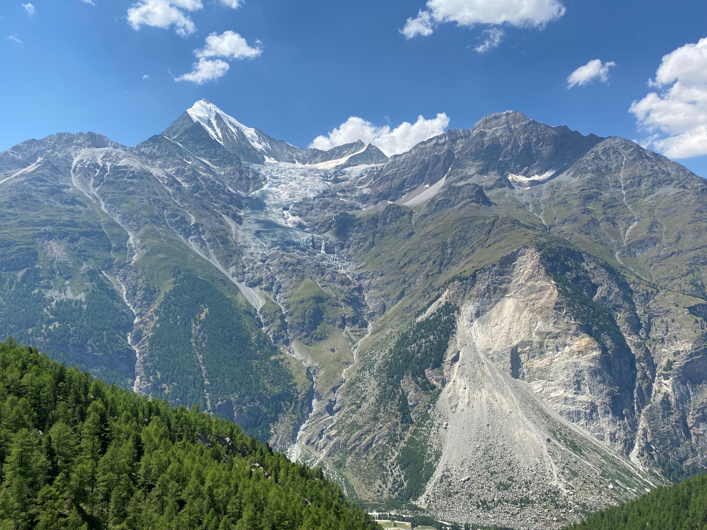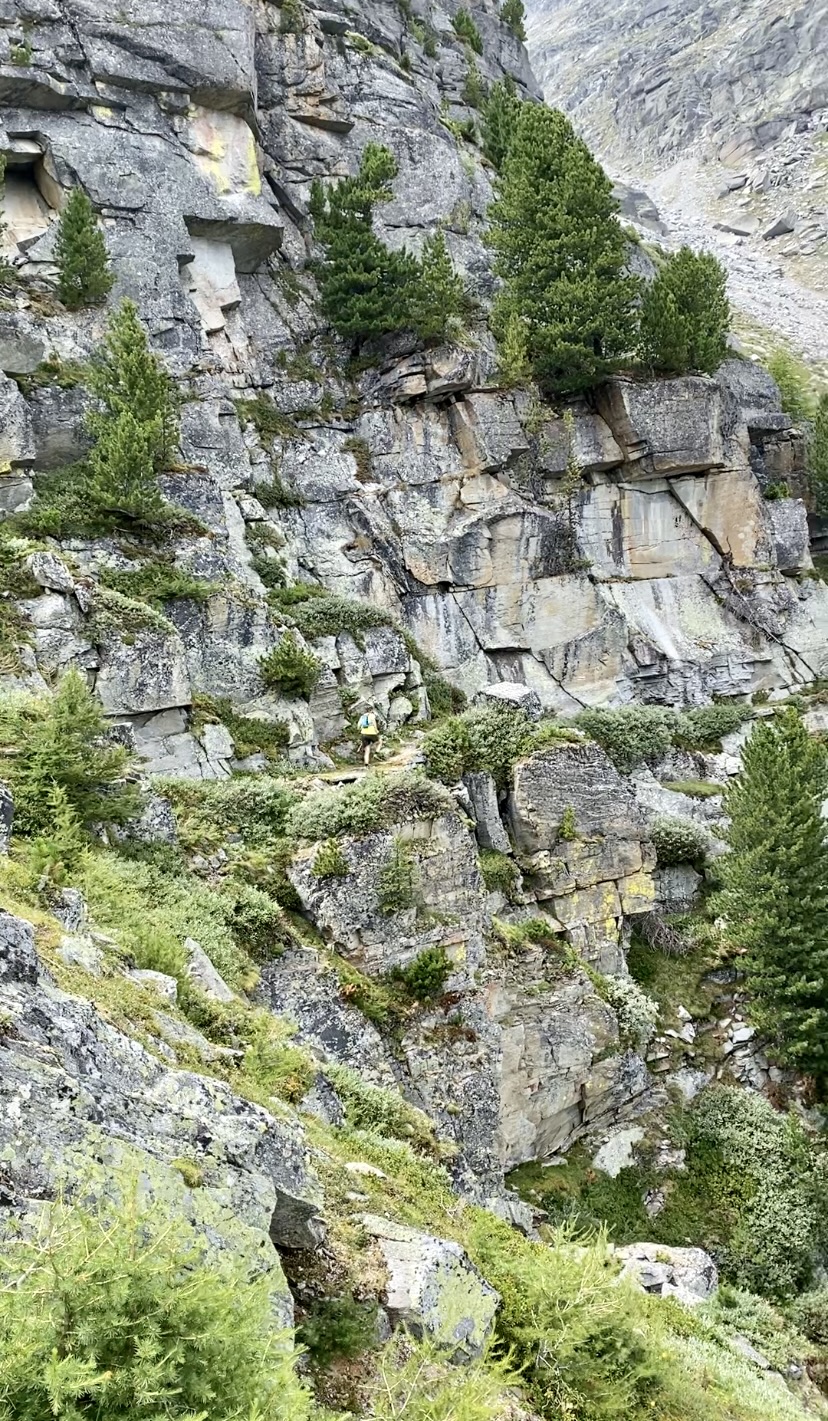 Sunnuntaina oli alun perin suunnitelmana kiivetä Allalinhornille sekä Alphubelille, mutta olosuhteista johtuen molemmat jäätiköt ovat tällä hetkellä erittäin vaarallisia. Kiipeily vaihtui hisseillä ajoon. Hotellin hintaan kuuluu ilmainen bussi- ja hissilippu (lukuun ottamatta Allalinhornin yläasemalle menevää junaa), joten päätimme kierrellä Saas-Feen laaksoa hissillä. Nousimme hissillä ensin Felskinnin asemalle ja kävimme katselemassa maisemia. Hämmästelimme jäätikön reunaa kulkevalla polulla vaeltavia ihmisiä, kun ylempää tuli jatkuvasti kivi- ja jäävyöryjä alas polulle. Monet lähtivät kuitenkin reitille tennareissa ja pikkurepuissa. Itse en olisi lähtenyt. Palattiin takaisin alas ja suunnattiin seuraavalle hissille. Kävimme ylhäällä katsomassa maisemia ja päätimme lähteä seuraavalta väliasemalta juosten alas, koska reitillä oli paljon murmeleiden koloja. Toiveissa oli nähdä murmeli, mutta ei niitä näkynyt. Koloja kyllä hyvinkin paljon. Alastulo oli jälleen aika jyrkkää hiekkaista polkua, joten juoksupätkiä ei lopulta paljon ollut. Alhaalla katsoimme kelloa ja totesimme, että jos oikein vauhdikkaasti kiivetään, niin ehtisimme vielä tunkata uudelleen ylös Hannigin asemalle ennen hissien sulkemista ja pääsisimme hissillä alas. Näillä väsyneillä jaloilla on helpompi nousta vuorenrinnettä ylös kuin juosta alas. Nousu oli tiukka ja hikinen. Matka oli pidempi, mitä opasteiden perusteella olimme päätelleet (ehkä missasimme jonkin käännöksen?) mutta ehdimme kuitenkin perille puolituntia ennen viimeistä hissiä. Reitti oli luultavasti myös kauniimpi, kuin alempana kulkeva mahdollisesti lyhyempi reitti. Matkalla näimme kesyjä vuohia, joista yksi tuli pussailemaan 😊.