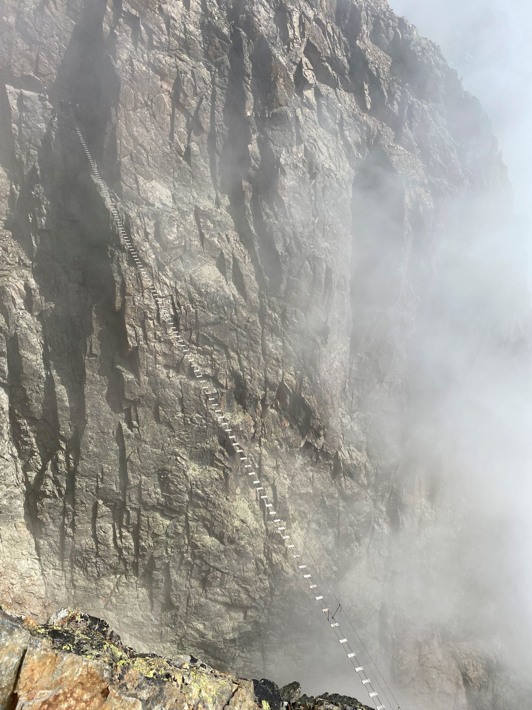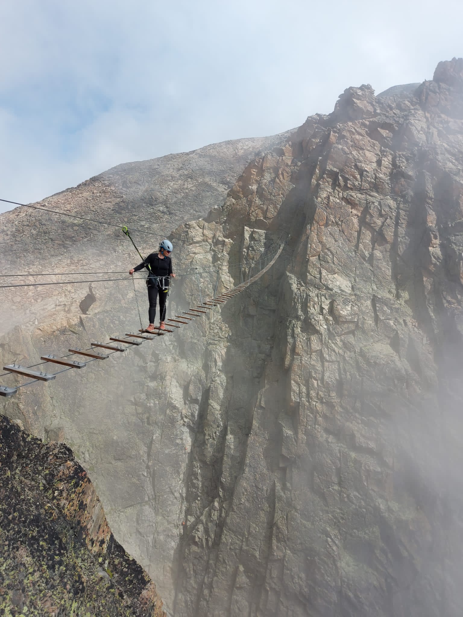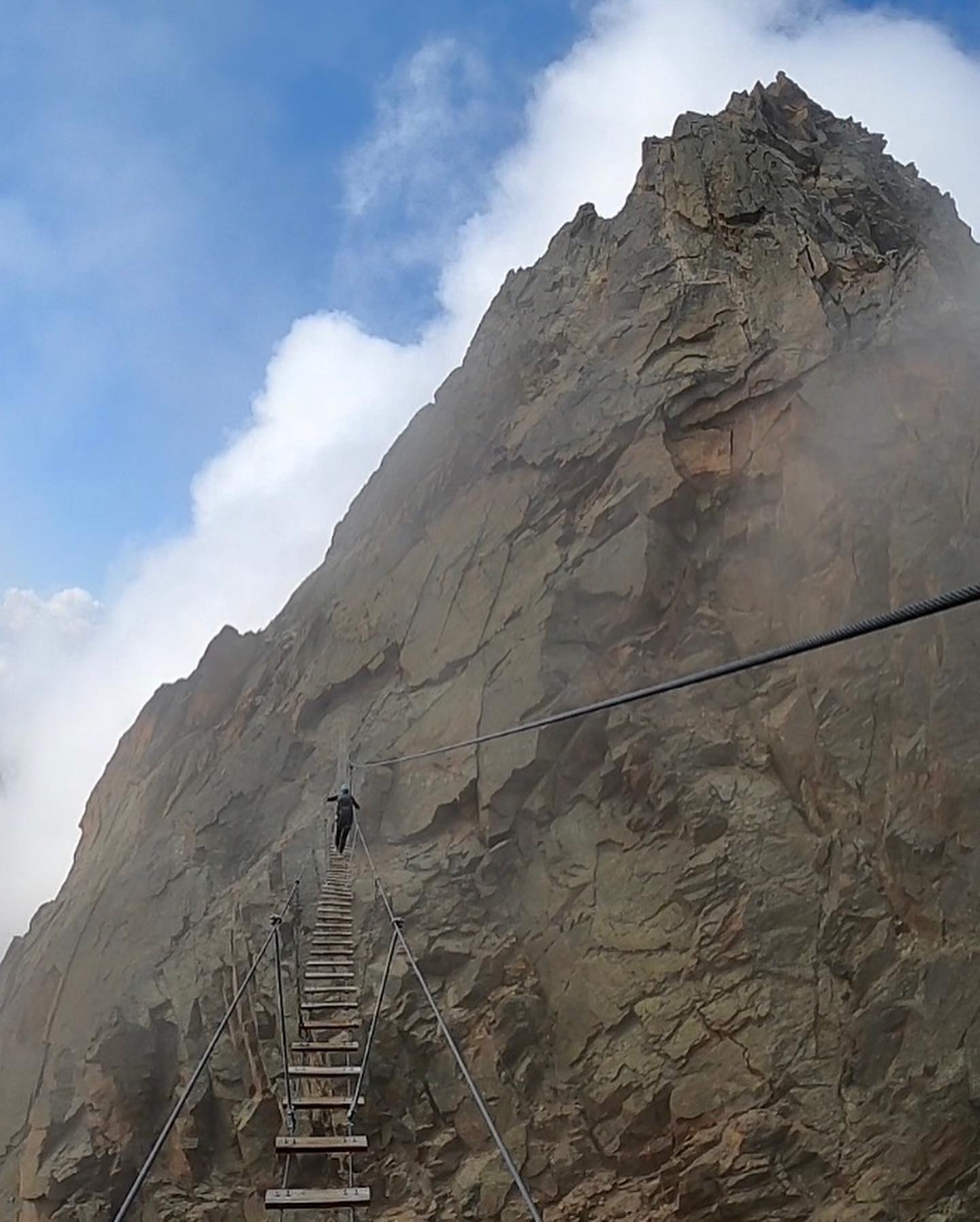 Aamulla lähdimme Jegihornin via ferrata reitille. Kyseessä on Länsi-Alppien korkein ja melko haastava reitti. Päivä oli hiukan pilvinen. Pilvet liikkuivat kuitenkin nopeasti, joten hetkittäin näkymät olivat myös kirkkaita, mutta seuraavassa hetkessä sumu saattoi peittää koko näkyvyyden. Reitti nousee ensin Jegigratin rinnettä ja kulkee huimaa riippusiltaa pitkin korkealla kahden vuoren välissä kohti Jegihornin huippua. Riippusilta oli aika kuumottava. Tässä kohdassa olisi ollut mahdollista valita helpompi reitti alakautta ja sillan jälkeen reitti muuttui aika haastavaksi kiipeämiseksi. Ehkä välillä jopa hiukan pelottavaksi. Ylös kuitenkin päästiin 3206 metriin ja ylhäällä oli voittajafiilis.