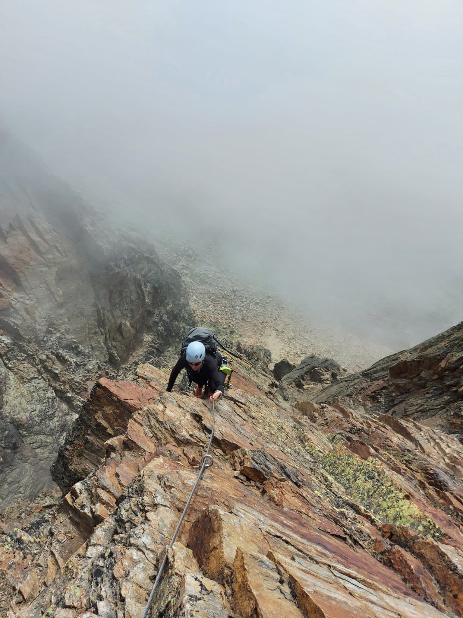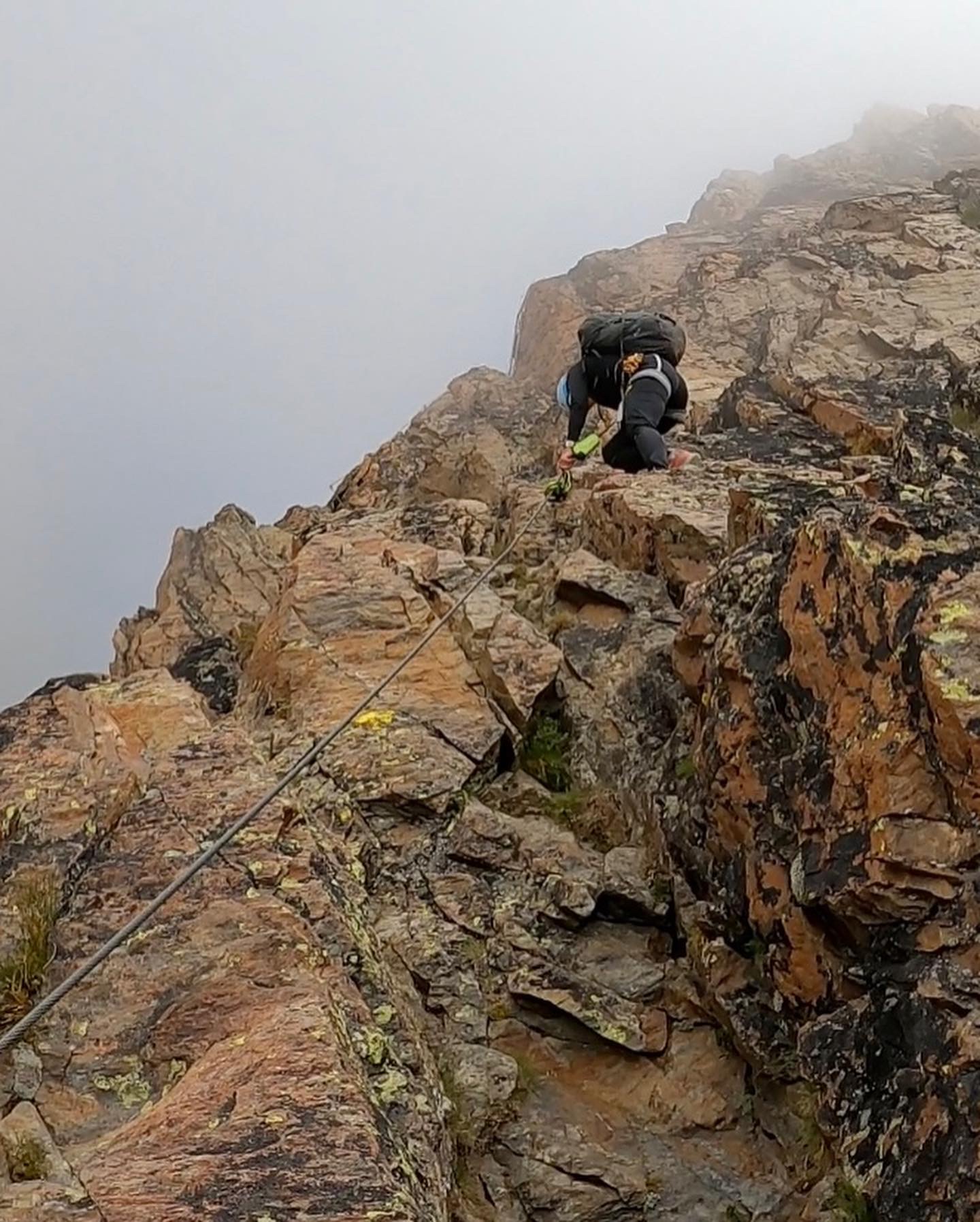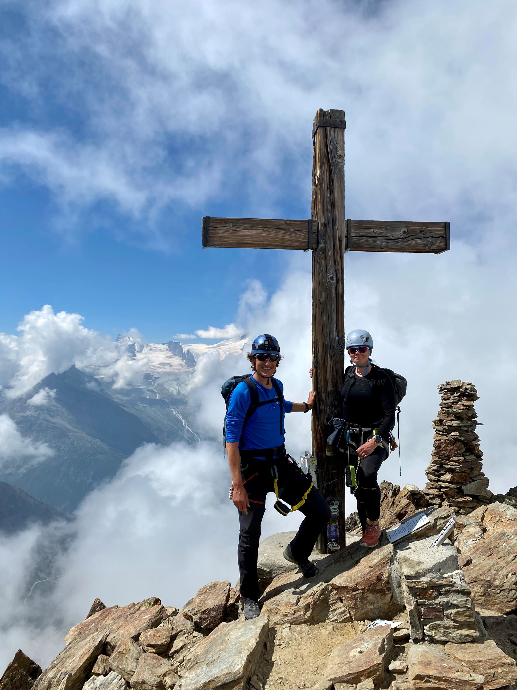 Aamulla lähdimme Jegihornin via ferrata reitille. Kyseessä on Länsi-Alppien korkein ja melko haastava reitti. Päivä oli hiukan pilvinen. Pilvet liikkuivat kuitenkin nopeasti, joten hetkittäin näkymät olivat myös kirkkaita, mutta seuraavassa hetkessä sumu saattoi peittää koko näkyvyyden. Reitti nousee ensin Jegigratin rinnettä ja kulkee huimaa riippusiltaa pitkin korkealla kahden vuoren välissä kohti Jegihornin huippua. Riippusilta oli aika kuumottava. Tässä kohdassa olisi ollut mahdollista valita helpompi reitti alakautta ja sillan jälkeen reitti muuttui aika haastavaksi kiipeämiseksi. Ehkä välillä jopa hiukan pelottavaksi. Ylös kuitenkin päästiin 3206 metriin ja ylhäällä oli voittajafiilis.