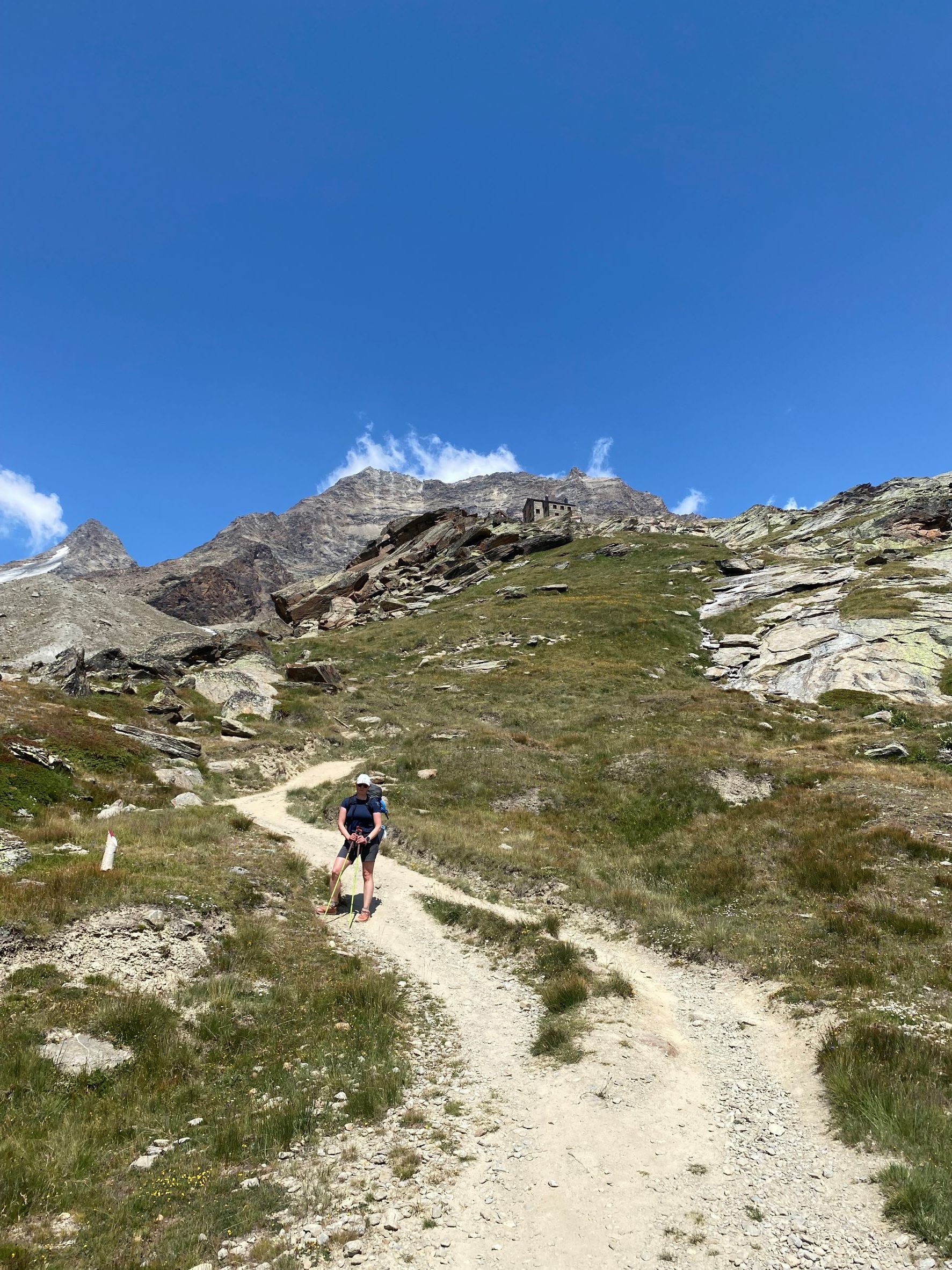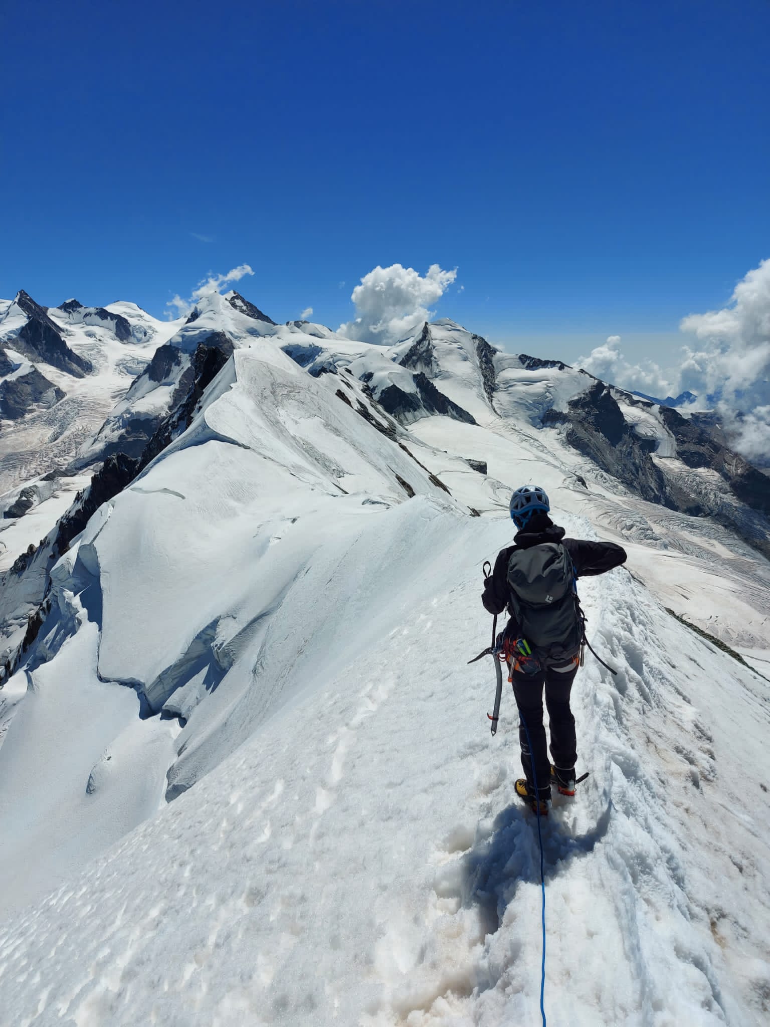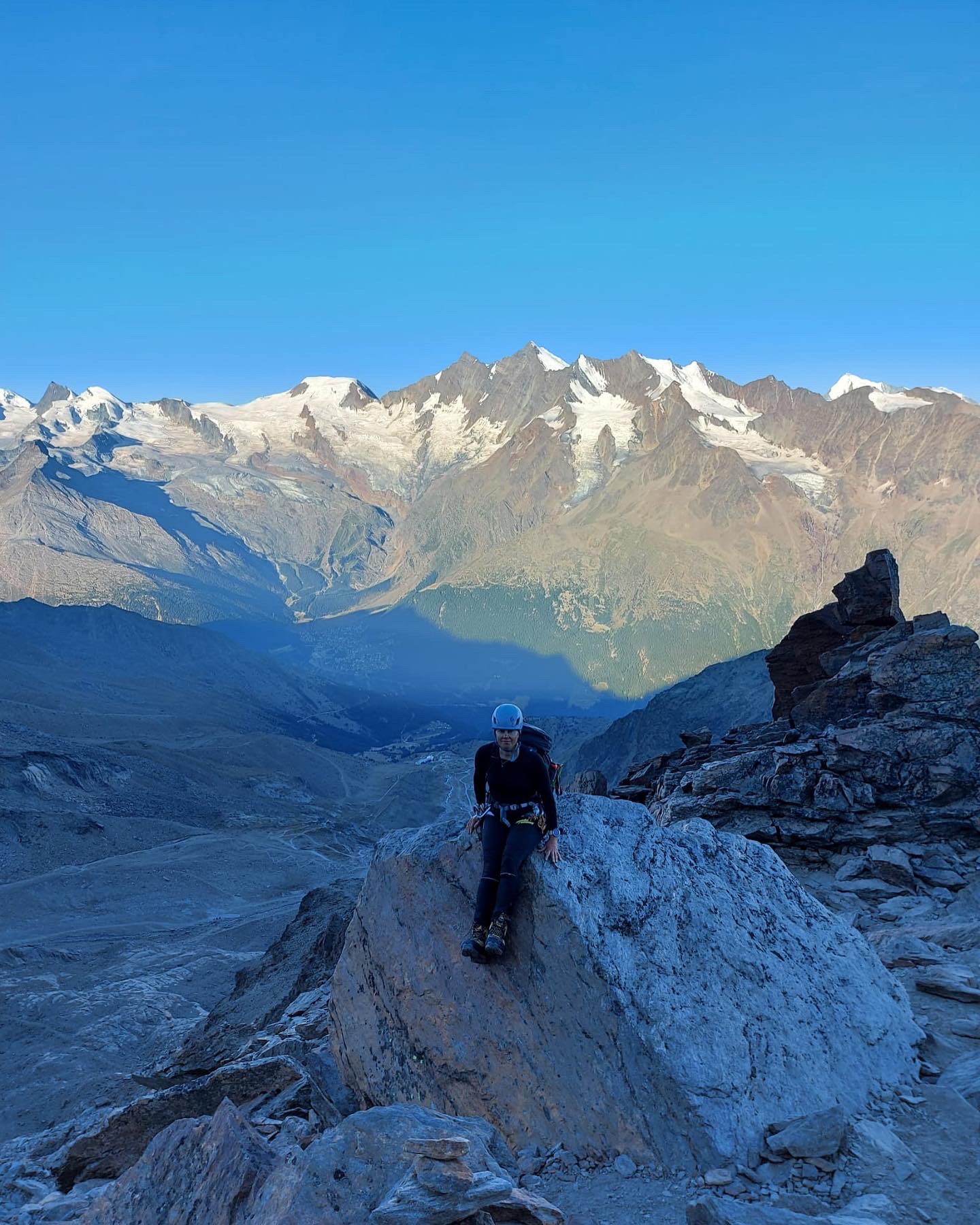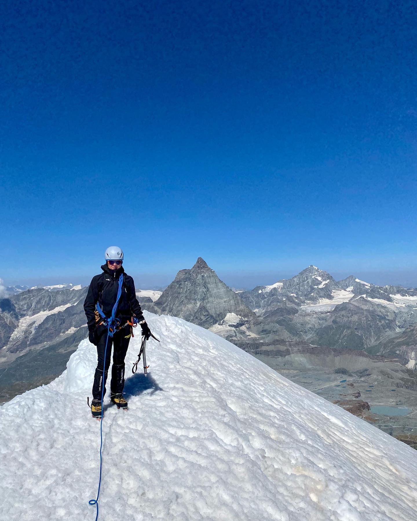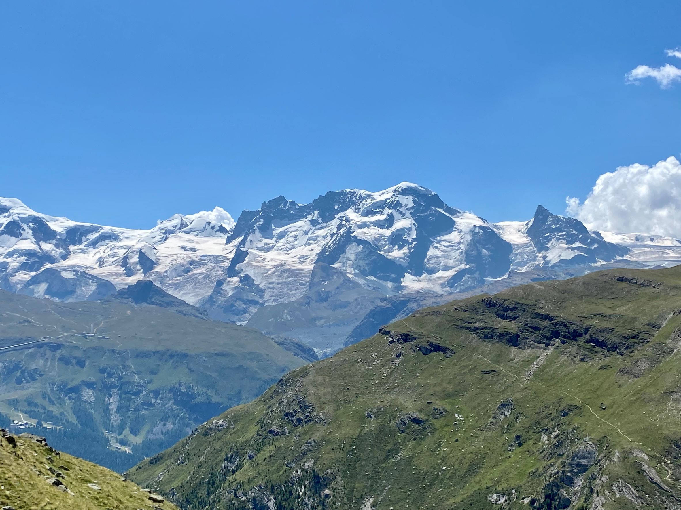 Seuraavana päivänä tiesi tunkanneensa. Etureidet ja pohkeet olivat jumissa ja kävelykin hankalaa. Suunnitelmissa oli nousta hissillä Klein Matterhornille 3883 metriin ja jatkaa siitä jalan Breithornin (Breithorn Occidentale) huipulle 4164 metriin. Emme olleet liikkeellä kovin aikaisin, joten lumi oli alkanut selvästi pehmetä auringossa. Nousu oli edellisen päivän väsyttämillä jaloilla raskas, mutta teknisesti helppo. Jatkoimme Breithornin huipulta vielä harjannetta pitkin seuraavalle huipulle, eli Breithorn Orientalelle 4139 korkeuteen ja palasimme samaa reittiä takaisin. Sää oli kirkas ja katselimme kaukana Italian puolella näkyviä huippuja, joille olimme kiivenneet parin vuoden takaisella reissulla. Alpeilla on ollut poikkeuksellisen lämmin kesä ja jäätiköt sulavat silmissä. Useat jäätiköt ovat muuttuneet vaarallisiksi, eikä kaikille pysty kiipeämään kesäkaudella enää lainkaan. Paluumatkalla Breithornilta alas polku oli muuttunut vuoristopuroksi, jota pitkin ei voinut enää kävellä. Kävely polun viertä jyrkässä lumisessa rinteessä oli nilkoille aika raskas. Breithornin reitti on ollut helppo, mutta nyt sielläkin alkaa olemaan railoja ja sulamisvesi syö jäätikköä myös alta päin.