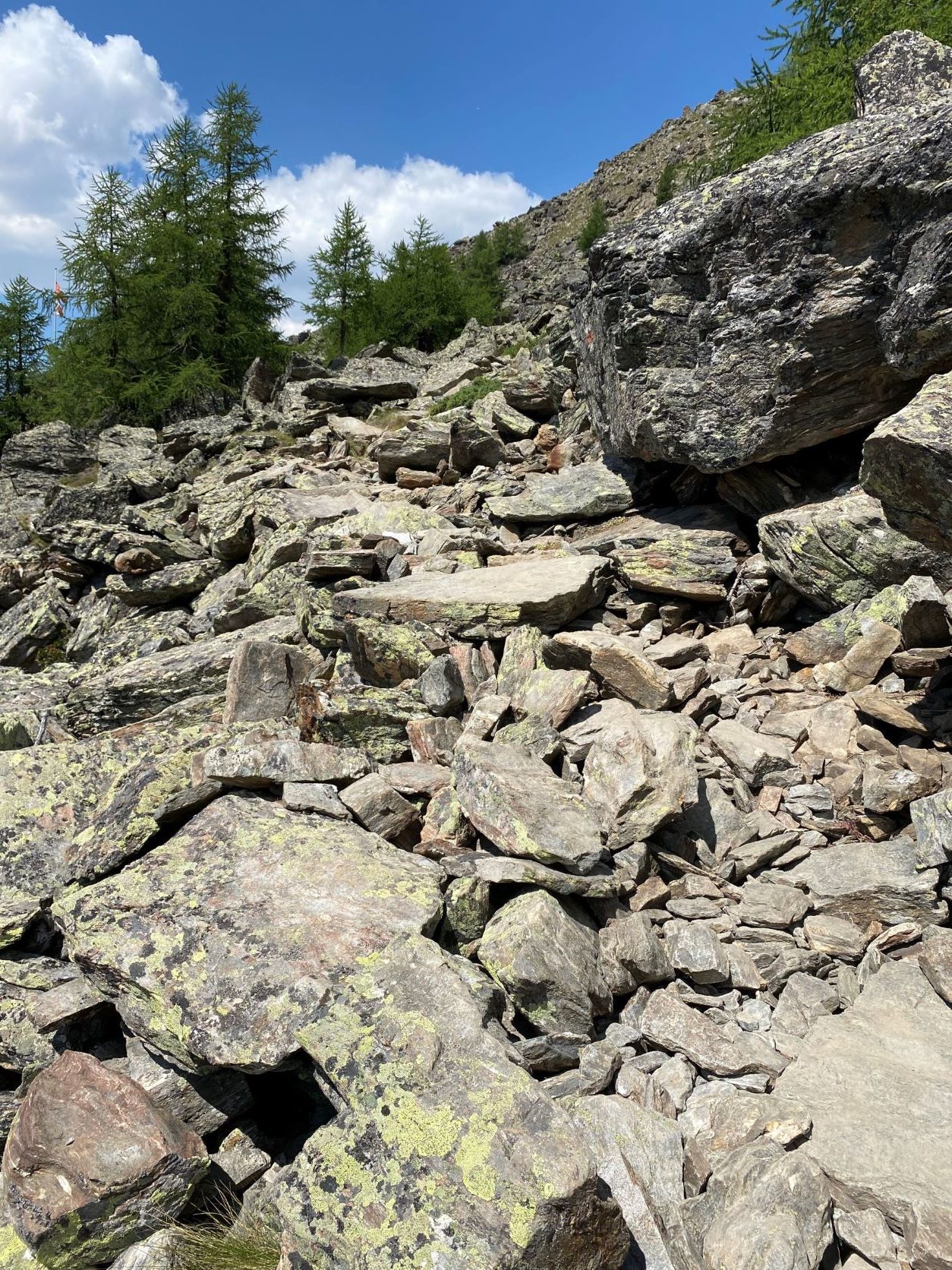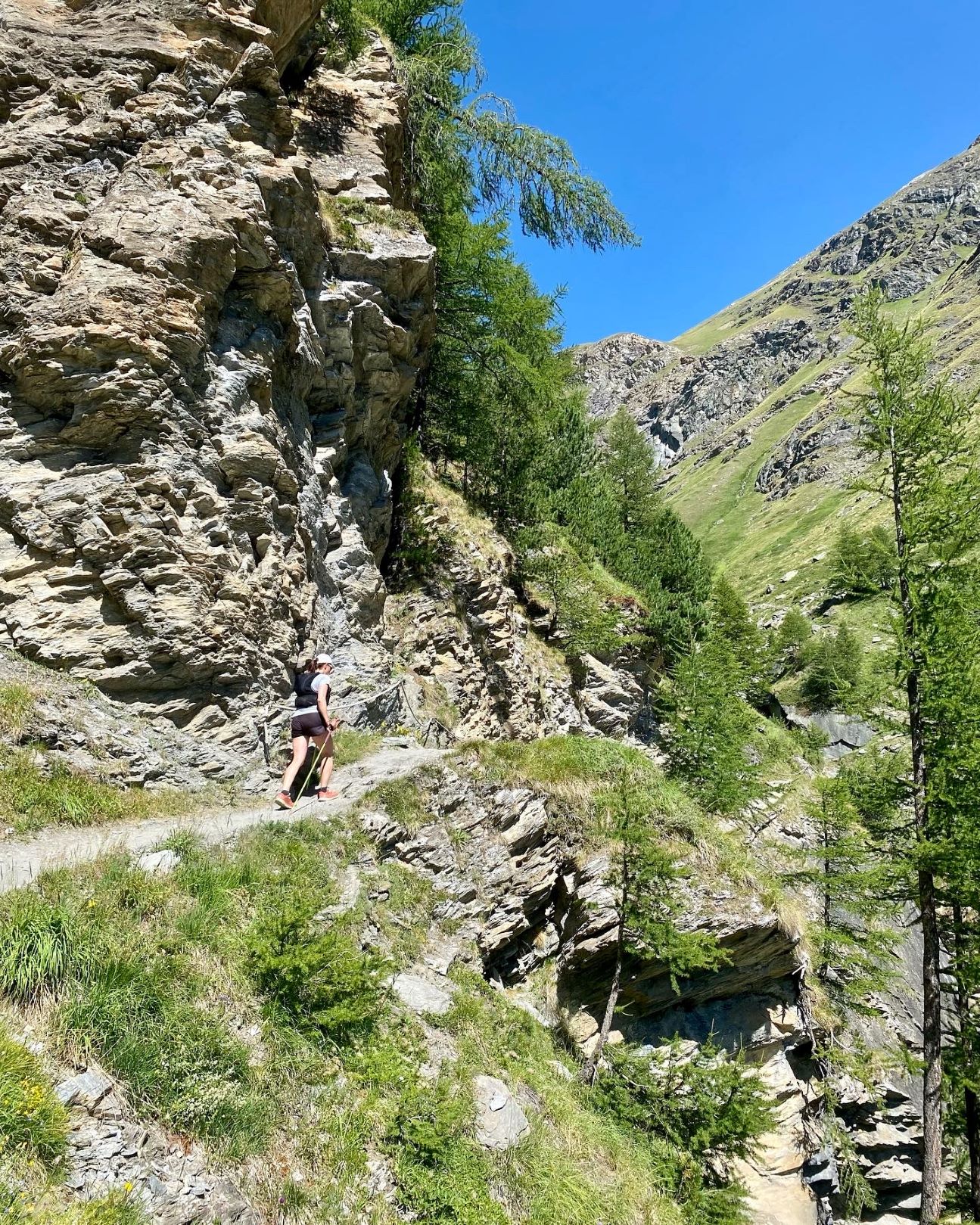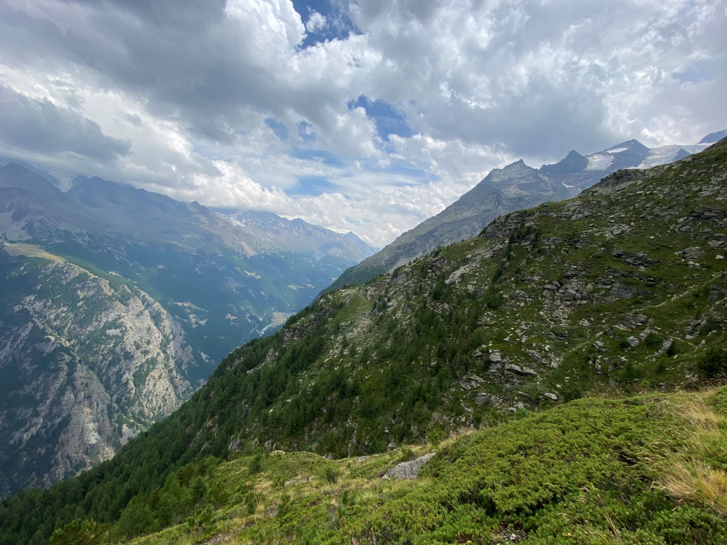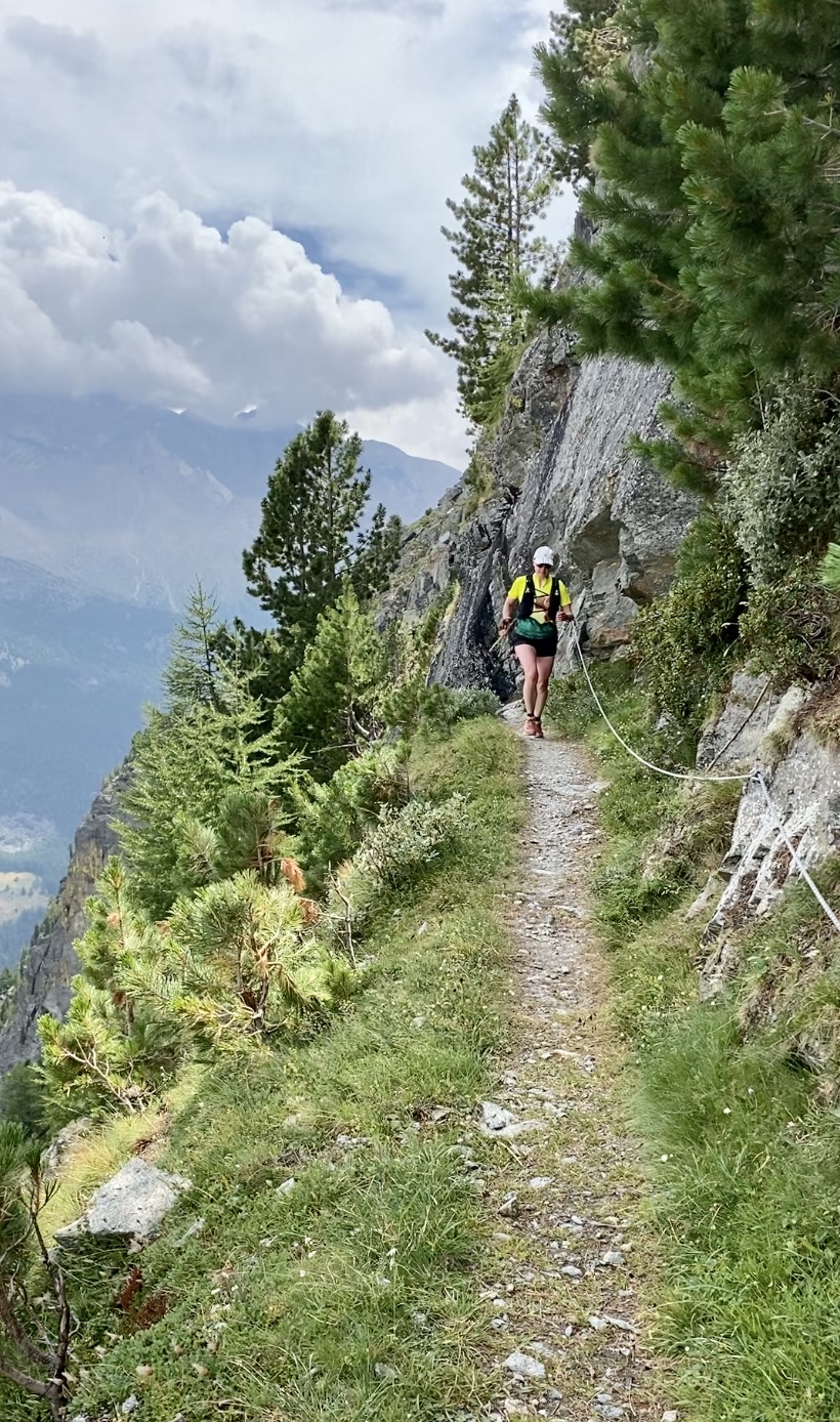 Lauantaina lähdimme juoksemaan Saastalin laaksoa pitkin Saas-Feesta melkein Staldeniin asti ja paluu Eistenin kautta. Juoksureitti kulki ylhäällä jyrkkien vuorten seinämissä ja oli erittäin kaunis. Päihittää monet aiemmin kulkemani reitit mennen tullen. Reitti oli osa Monte Rosa trailin kisareittiä. Aiemmat kiipeilyt painoivat jaloissa, mutta tasaisemmat pätkät sekä loivat alamäet pystyi kuitenkin juoksemaan. Reitti oli pääosin hyväkulkuinen, mutta kun käännyimme alas ja takaisin päin kohti Eisteniä, muuttui polku pieneksi ja vähän kuljetuksi, joka välillä katosi kokonaan. Polku oli jyrkkä ja siinä oli paljon irtonaista multaa tai soraa, joka liukui kengän alla. Väsyneillä jaloilla siinä ei montaa juostavaa pätkää ollut. Näimme myös ihania mustanaamaisia ja -polvisia alppilampaita. Niitä laiduntaa täällä pitkin vuorenrinteitä. Eistenistä palasimme bussilla Saas-Feen kylään. Matkaa tuli noin 21 km ja nousua kohtuulliset 1022 metriä.