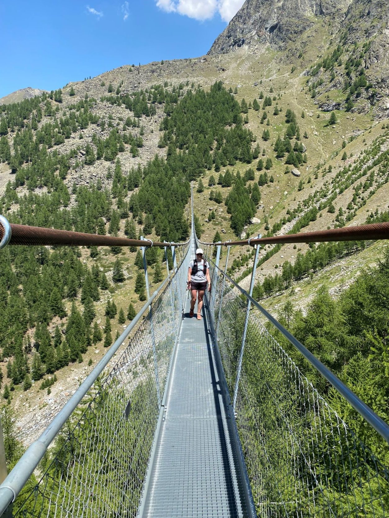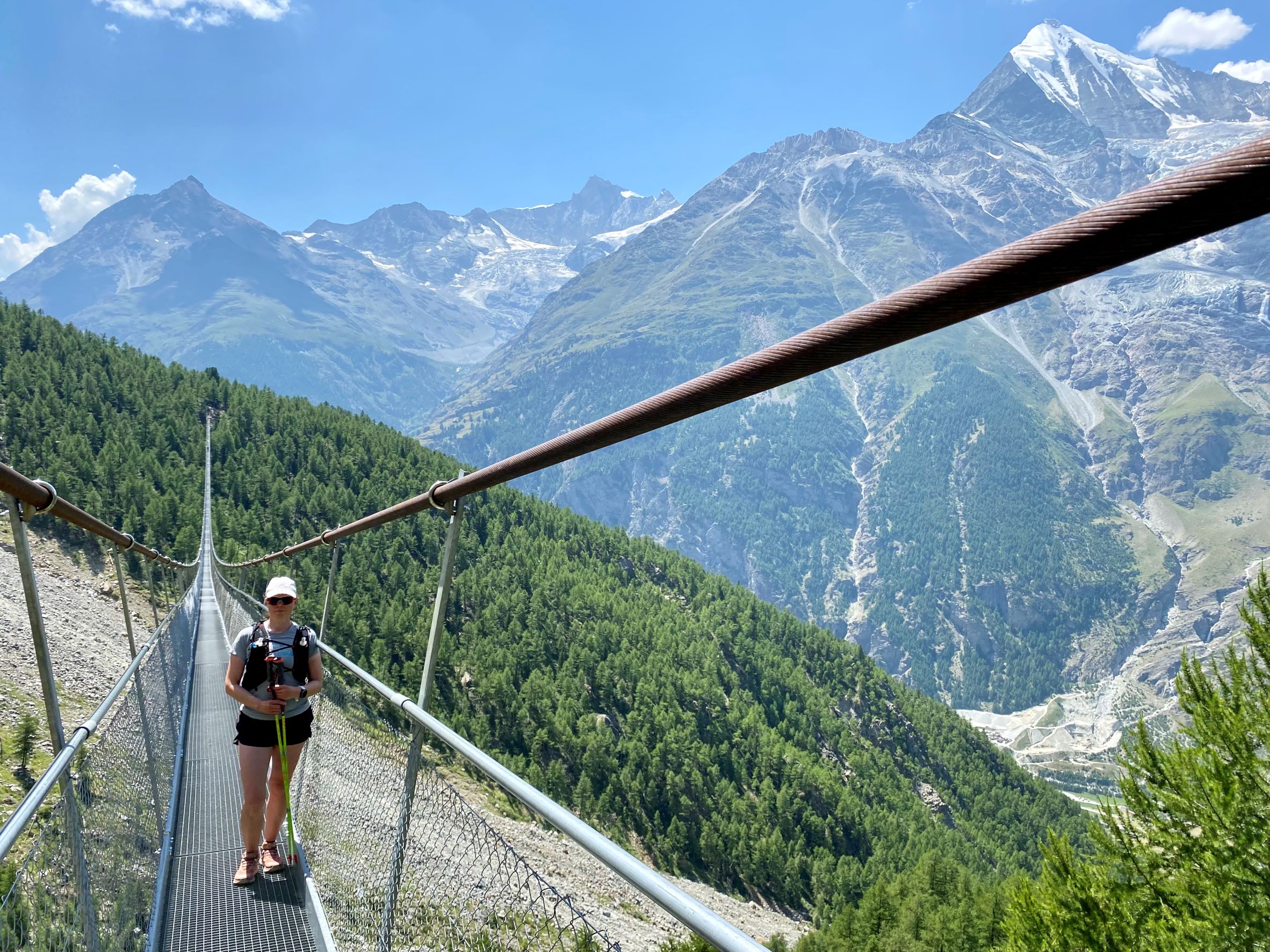 Rotkon jälkeen siirryimme junalla Randan kylään. Lähdimme nousemaan melko jyrkkää vuorenrinnettä ylös Charles Kuonen riippusillalle, joka on Alppien pisin riippusilta, 494 metriä pitkä ja korkeimmillaan 85 metrin korkeudessa. Sillalta näki kivivyöryjä, jotka vyöryivät alas samaista rinnettä ja vanhan polun yli. Onneksi rinnettä ei tarvitse enää ylittää alhaalla kulkevaa polkua pitkin. Maisemat sillalta mm. Weisshornille olivat täältä todella upeat. Sillan jälkeen jatkoimme vielä Europa Huttelle syömään kevyen lounaan. Hienolla paikalla vuoristomaja. Sää oli lämmin ja aurinkoinen, kuten muinakin päivinä reissun aikana. Palasimme toista reittiä alas Randan kylään ja junalla takaisin Zermattiin. Zermatt on tosiaan täysin autoton kylä. Paikalliset yrittäjät voivat erillisellä luvalla ajaa täällä pienillä sähköisillä koppiautoilla, jotka muistuttavat golfkärryä, mutta muuten sinne ei autoilla eikä busseilla pääse.