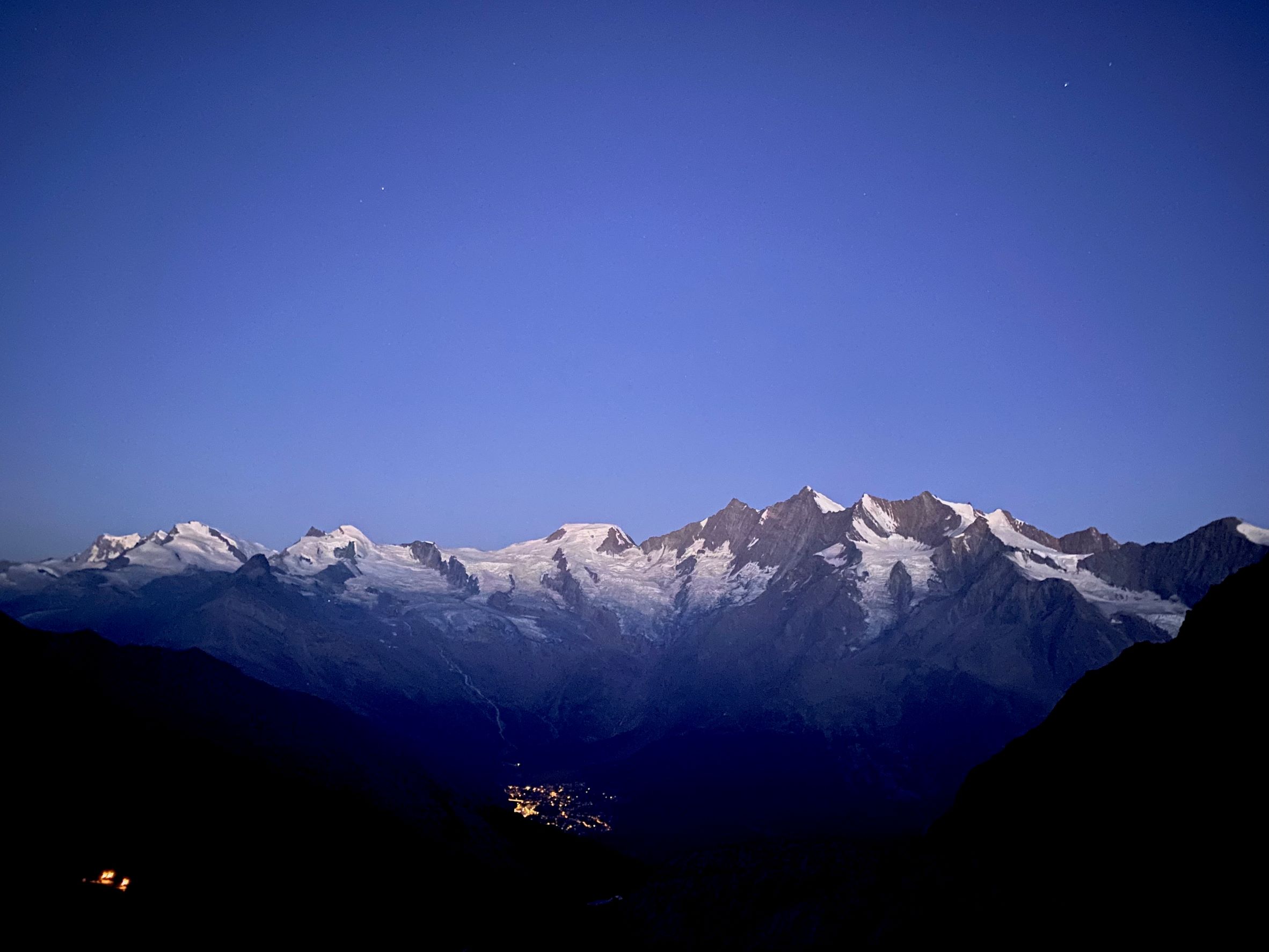 Perjantaiaamuna lähdimme alppistartilla kohti Lagginhornin huippua 4010 metriin. Liikkeelle lähdettiin hieman puoli viiden jälkeen otsalamppujen valossa. Aika pian auringon kajastus alkoi värjäämään takana olevien vuorten huippuja. Kaunista. Reitti oli kivikkoinen ja hyvin haastava. Huiputus ei tullut helpolla, mutta oli sitäkin palkitsevampi ja maisemat olivat jälleen upeat. Alastulo väsyneillä jaloilla isossa kivikossa oli haastavaa ja hidasta. Nousua tuli kaikkiaan noin 1300 metriä. Palasimme majalle, söimme, pakkasimme tavarat ja lähdimme alaspäin hissiasemalle. Hissillä alas Saas Grundin kylään, josta bussilla Saas-Feehen ja hotellille. Jäimme pois ennen keskustaa kohdassa, josta oli lyhyempi matka hotelille, mutta reitti tätä kautta oli hyvin jyrkkä. Jatkossa kuljemme keskustan kautta, vaikka matka onkin pitempi. Näinhän se menee, vuoren huipulle voi tunkata yli 1000 nousumetriä, mutta kylän läpi hotellille rinkan kanssa 100 nousumetriä on liikaa.