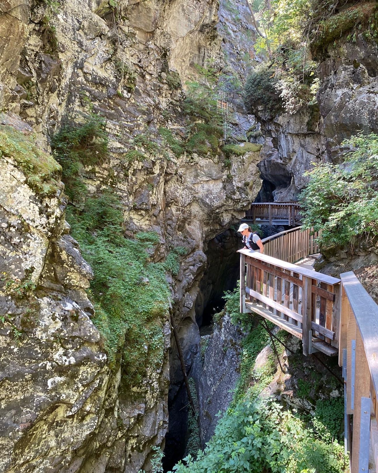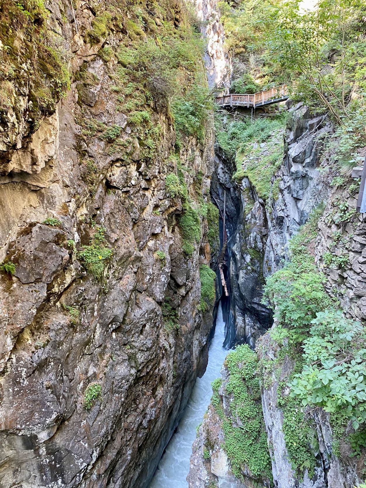 Tiistaina kävimme heti aamusta kävellen katsomassa Gorner Gorge rotkoa. Opasteita sinne ei juurikaan ole, joten ihan ensimmäisellä yrittämällä ei osuttu oikeaan paikkaan. Kun lopulta pääsimme perille, totesi kassatyttö, että täällä käy vain käteinen. Eli takaisin kylään ja nostamaan rahaa ja uusi yritys. Niin pankkimaa kuin Sveitsi onkin, täällä on hyvä varautua siihen, että monessa paikassa käy vain käteinen. Tällä kertaa pääsimme katsomaan rotkoa, joka on todella vaikuttava. Syvällä rotkon seinämässä kulkee puiset kulkusillat, jotka ovat rakennettu jo 1800-luvulla (luultavasti kyllä korjailtu ja uusittu välillä, ainakin uskottelen itselleni niin). Kävelimme rotkon päässä olevaan kylään ja palasimme samaa reittiä takaisin.