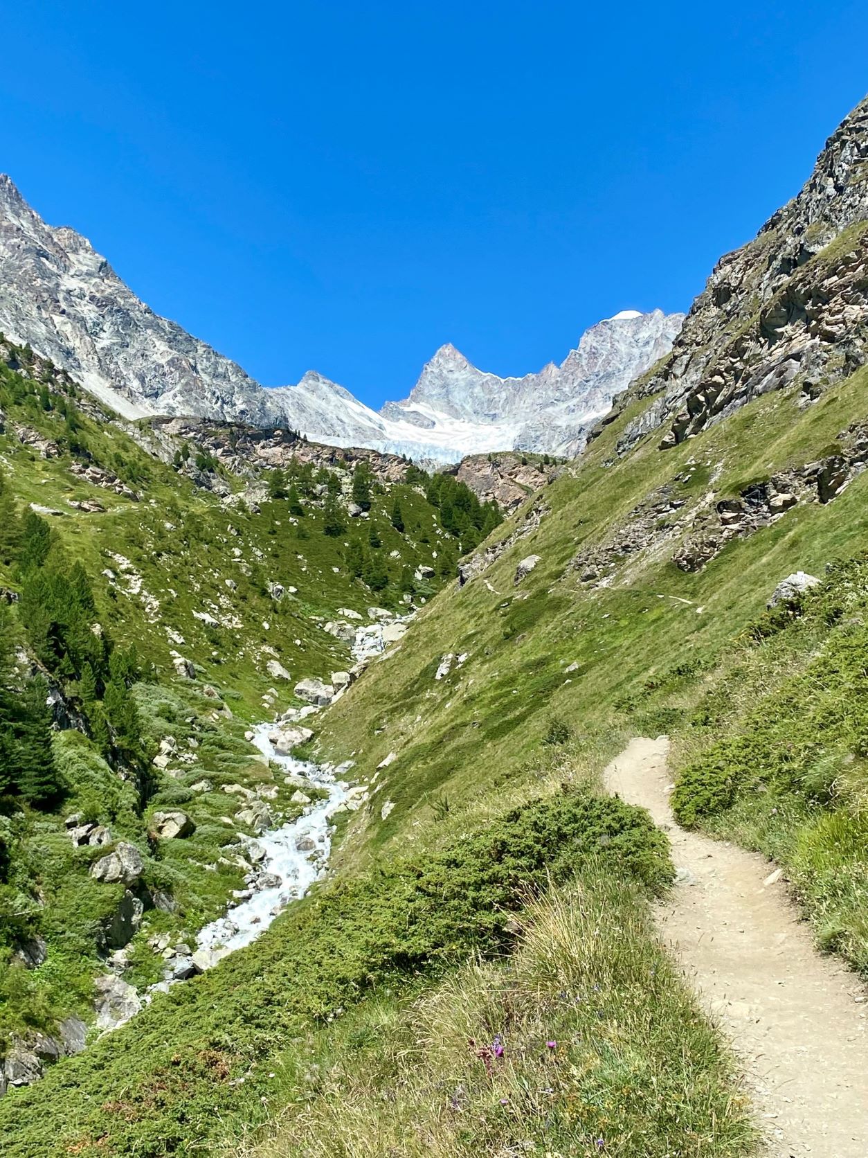 Ensimmäisenä päivänä lähdimme juosten (=sauvakävellen) kohti Mettelhornin huippua 3405 metrin korkeuteen. Matkaa tuli hiukan alle 20 km ja nousua n. 1700 metriä. Aika rankka aloitus ensimmäiselle päivälle ja vähällä treenillä. Mennessä pysähdyimme Triftin majalle juomaan paikallista jääteetä ja paluumatkalla kahvila Edelweisissä kylmät oluet. Kummastakin on hienot näkymät sekä kylään, että ympäröiville vuorille. Etenkin alkumatkasta maisemat olivat kauniita ja vihreitä polun kiemurrellessa vuoristopuron vartta. Täällä on todella paljon perhosia sekä heinäsirkkoja. Suomessa etenkin perhosten määrä on laskenut rajusti, mutta ihana nähdä, että niitä vielä jostain löytyy näin paljon. Loppumatka muuttui hieman karummaksi, kun niissä korkeuksissa ei juuri mikään enää kasva. Ylhäällä oli myös luminen osuus ylitettäväksi. Viimeiset nousumetrit huipulle olivat jyrkkiä, mutta maisemat olivat jälleen huikean kauniit. Alaspäin tullessa tunsi kyllä reisissä, että viimeaikojen treeni on jäänyt vähäiseksi.