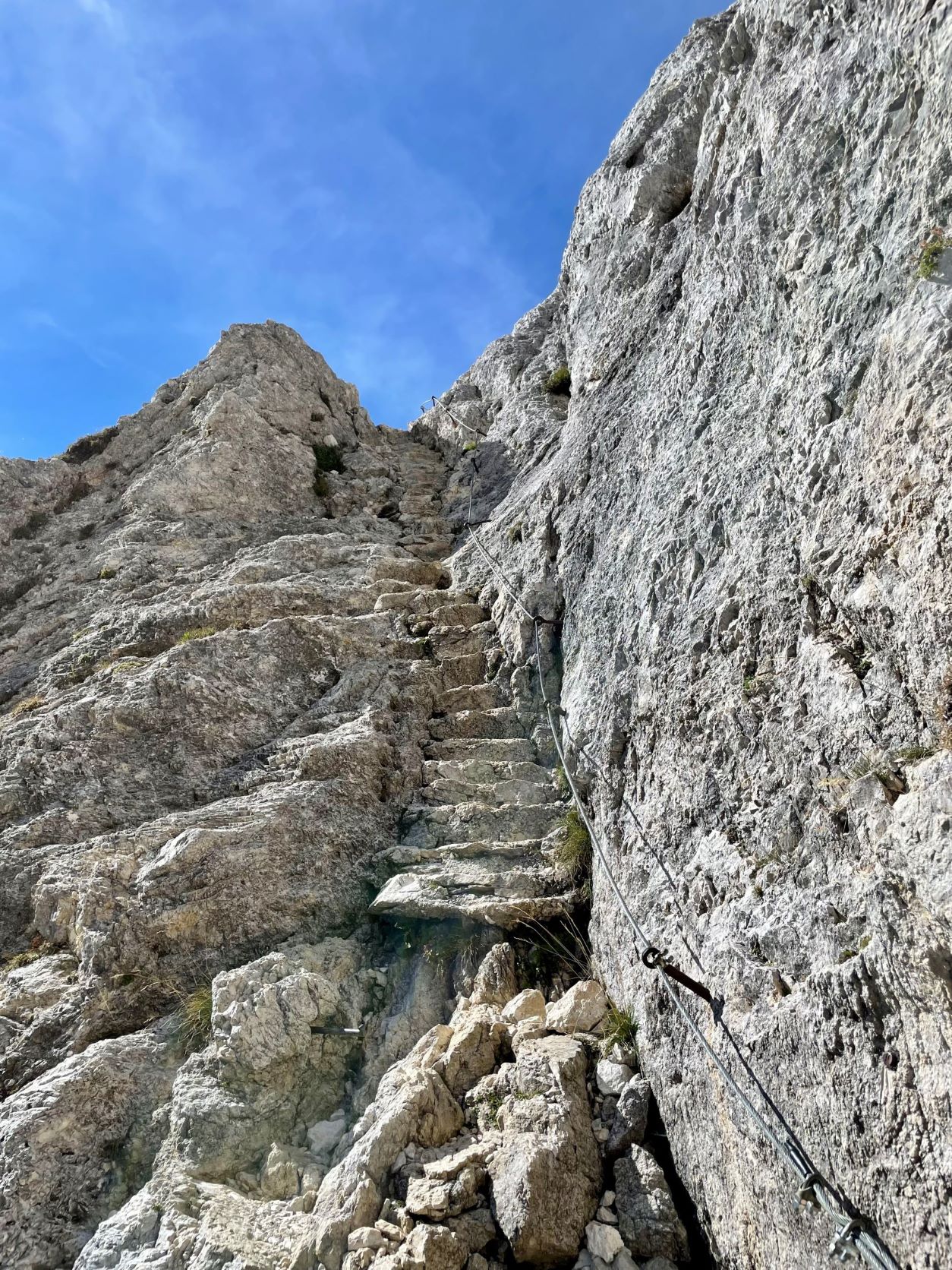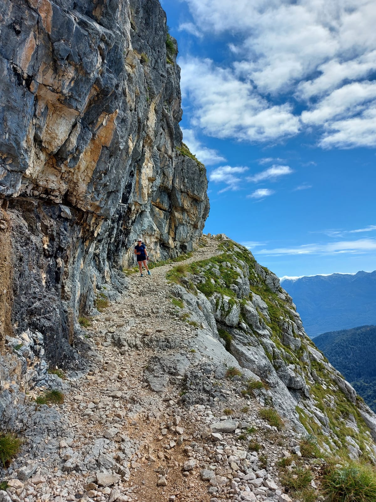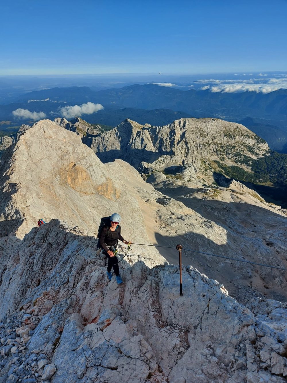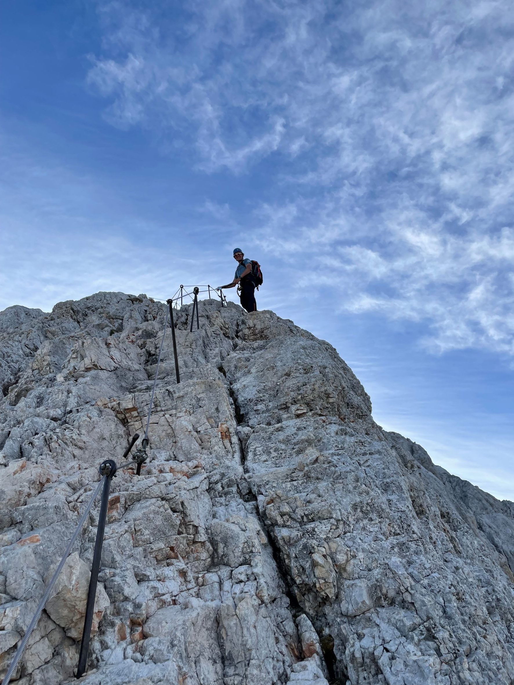 Aluksi reitti lähtee nousemaan melko jyrkästi metsän läpi. Välillä maisema avautuu alas laaksoon ja viereisille vuorille. Välillä taas kulkee puiden keskellä juurakossa. Ylempänä meno hieman tasaantuu ja kuljetaan vuoren reunaa toiselle puolelle ja solan yli. Päivä oli tosi lämmin. Ensimmäinen lyhyt pysähdys ja vesipullojen täyttö oli matkalla sijaitsevalla vuoristomajalla. Tästä matka jatkui taas jyrkemmin ylöspäin ja nyt edettiin jo puurajan yläpuolella. Olimme suunnitelleet ensin yöpyvämme Dom Planika vuoristomajalla ja vasta aamulla nousevamme viimeiset 400 metriä Triglavin huipulle. Seuraavalle päivälle oli kuitenkin luvattu huonoa keliä, joten päätimme yrittää nousua vielä samana iltana ja palata sen jälkeen majalle. Ainoa rajoite tässä olisi ruokailu, joka oli klo 18-20 välillä. Jos tuosta myöhästyy, jää ilman ruokaa. Myös aurinko laskee noin klo 20, joten ennen pimeän tuloa pitäisi ehtiä alas jyrkemmältä osuudelta. Koska reittimme kulki joka tapauksessa majan ohi, kirjauduimme jo tässä vaiheessa sisään ja jätimme osan tavaroista sängyillemme. Samalla vaihdoin pitkät housut jalkaan ja takin päälle. Puimme myös valjaat ja kypärät sekä via ferrata setin. Sitten vain reippaasti sauvomaan ylöspäin. Reitti oli tosiaan aika haastava, mutta onneksi pahimmissa paikoissa pystyi kiinnittymään vaijereihin. Nousu oli raskas, mutta pääsimme huipulle. Oli hienoa olla vaihteeksi vuoren huipulla illalla, kun aurinko alkaa pikkuhiljaa laskemaan ja värjää sekä pilviä että vuorenhuippuja. Lännen suunnasta nousikin jo pilviä, jotka roikkuivat aika matalla peittäen laakson, mutta itse olimme reilusti pilvien yläpuolella auringonpaisteessa. Muihin ilmansuuntiin oli vielä täysin kirkasta.