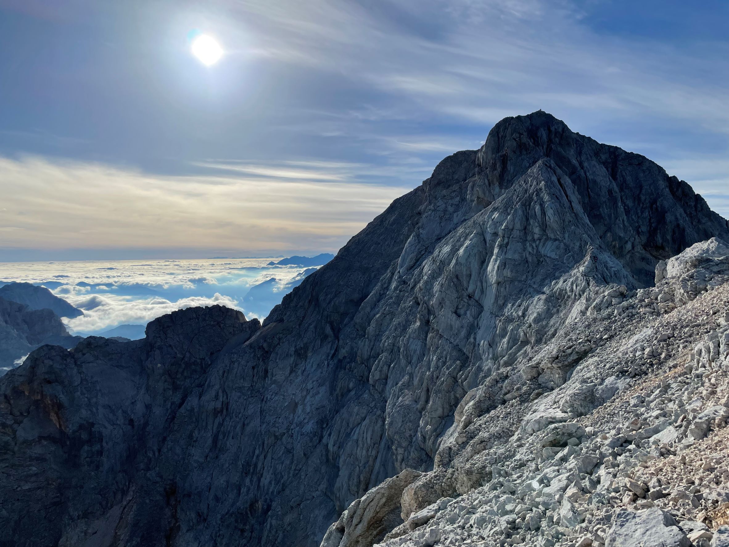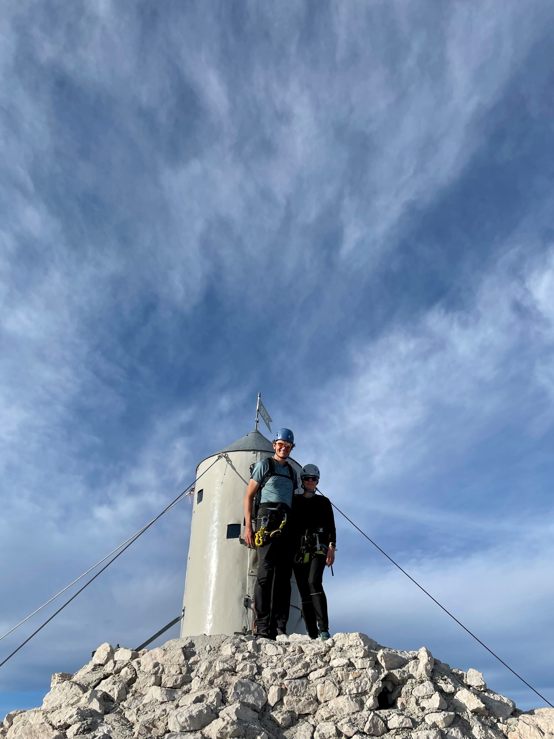 Huipulla on Slovenialaisille tärkeä symboli, Aljazevin torni, joka on itseasiassa pieni bivymaja. Perinteen mukaan jokaisen Triglaville ensimmäistä kertaa nousevan täytyy kurkistaa tornin luukusta sisään ja samalla kaveri piiskaa pyllylle tornin sisältä löytyvällä köysinipulla. Koitimme kysellä, mistä tällainen perinne mahtaa olla peräisin, muta kukaan ei osannut sanoa. Niin on kuulemma aina tehty. Ja niin mekin teimme. Hölmöt turistit! Toisaalta tämä oli oikein kiva traditio ja yhdisti mukavasti huipulla olevia ihmisiä, kun kaikki kuvasivat vuorollaan toisiaan ja naureskelivat. Sitten olikin jo aika kiirehtiä alas, jotta ehtii vielä illalliselle. Reitti alaspäin ei ollut yhtään helpompi kuin ylös. Itseasiassa vielä haastavampi ja vaijerien varassa sai mennä varovasti. Reitti on merkitty aika harvakseltaan kallioon piirretyillä punaisilla nuolilla tai ympyröillä ja haarautuu jossain kohdassa toiselle vuoristomajalle. Tässä kohdassa emme huomanneet sen enempää merkkiä kuin toista polkuakaan ja jatkoimme lyhyen matkaa väärään suuntaan, ennen kuin huomasimme erehdyksen. Siispä takaisin ylös ja oikealle reitille. Pidimme reipasta vauhtia yllä ja saavuimme oman vuoristomajamme pihaan juuri kun aurinko oli laskenut ja ehdimme vielä illallisellekin.