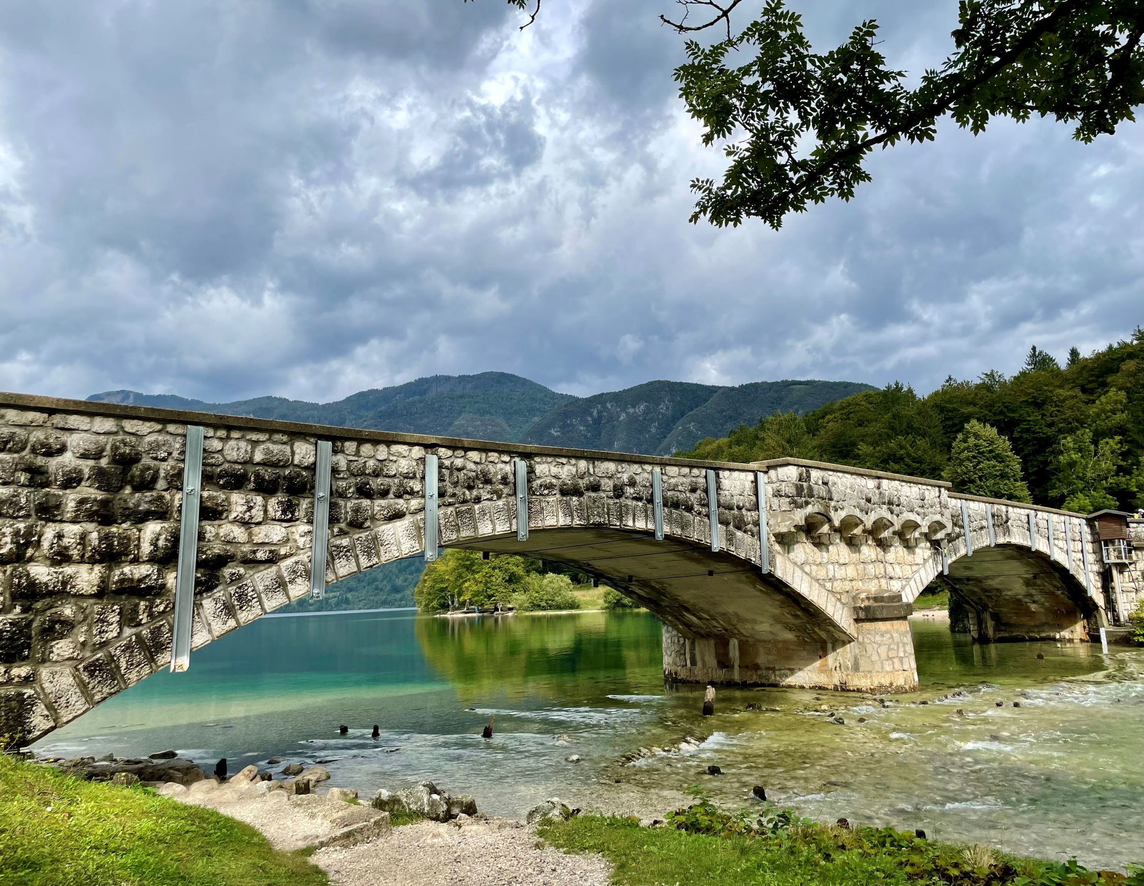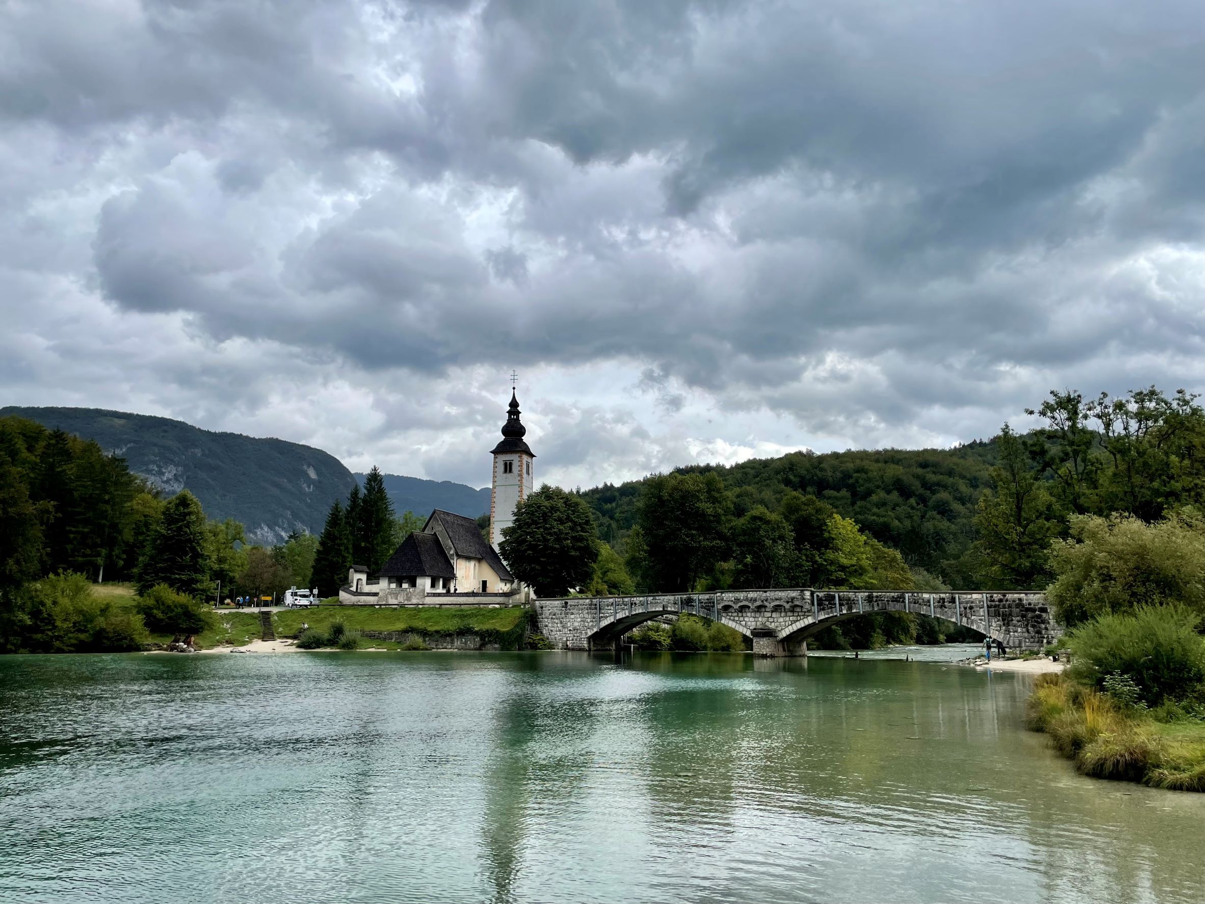 Ajoimme takaisin alas ja seuraavan yön maatilamajoitukseen Stara Fuzinan kylään Bohinjiin. Majoituksemme oli oikein mukava maatalo, jossa oli kanoja, lehmiä ja hevosia. Lehmät ja hevoset tosin olivat laitumella kauempana. Talon pihassa oli soma pieni mökki, johon emäntä kattoi meidän aamiaisen. Tämä oli oikein viehättävä paikka! Kävimme vielä kiertelemässä Bohinj järven rannalla ihailemassa maisemia ja kirkkaan vihreää vettä. Järven päässä on vanha kivisilta sekä ennen 1300-lukua rakennettu upea kirkko, jota täytyi tietysti kuvata.
