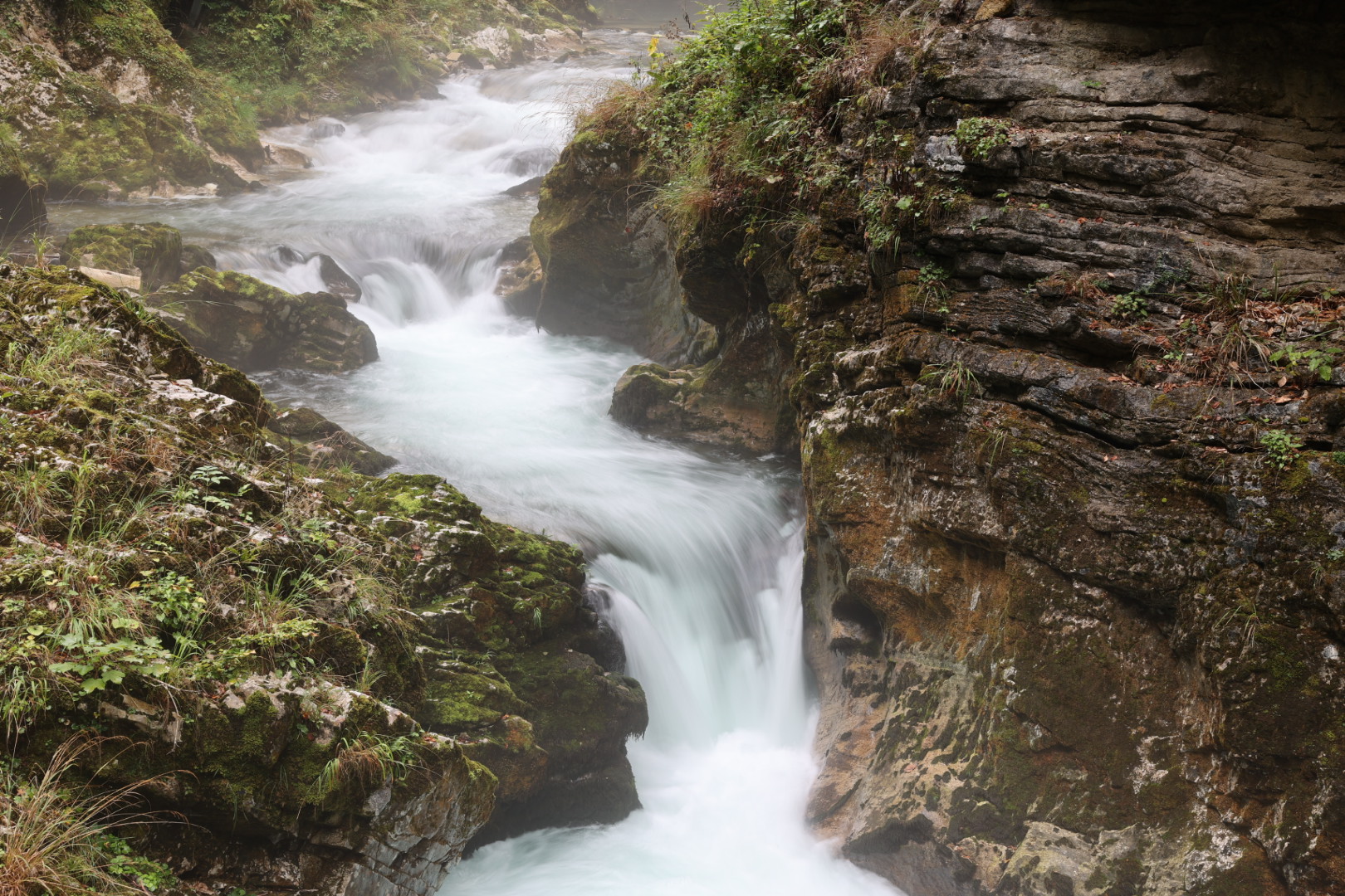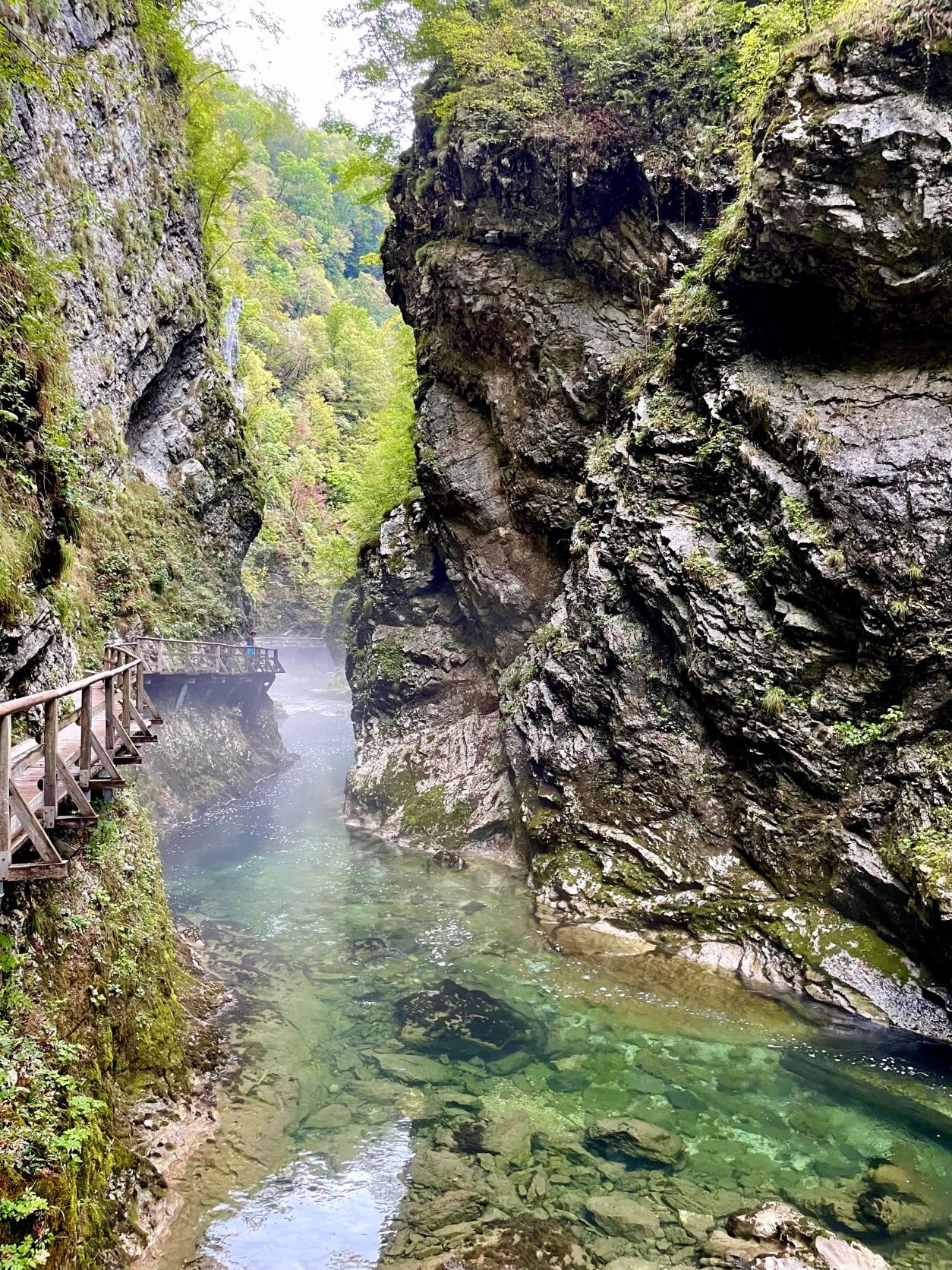 Bledin jälkeen pysähdyimme vielä Vintgar rotkolle. Tämä oli upea rotko. Vihreä vesi virtasi rotkon pohjalla ja kiviseinämät nousivat korkeuksiin. Kostea sumuverho leijaili joen pinnalla. Osassa rotkoa oli rakennettu puiset kävelysillat jyrkänteen seinämille. Rotko oli aika pitkä ja paluumatka viereisen kylän kautta tuntui vielä pidemmältä. Triglavin reissu painoi jaloissa. Mutta rotko oli ehdottomasti kävelylenkin arvoinen.