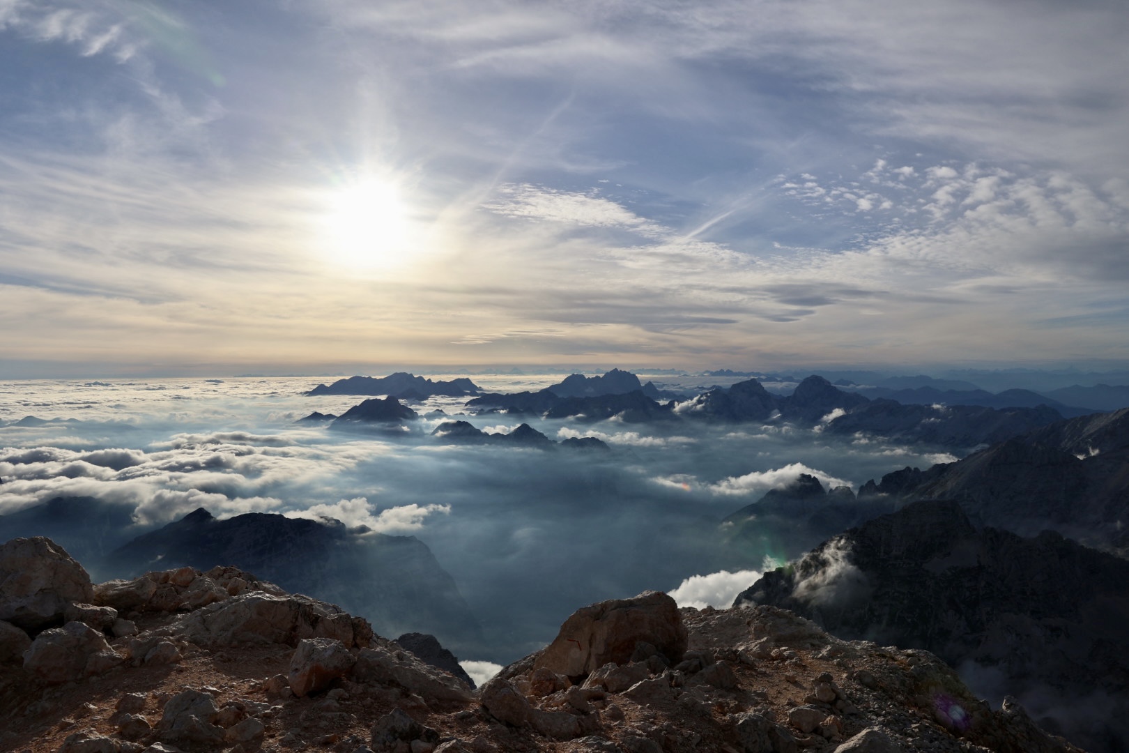 Aamulla heräsimme kovaan tuulen ujellukseen. Auringon nousu näkyi vielä kauniina pilviverhon alapuolella, kunnes koko maisema katosi pilvien peittoon. Tuuli oli todella kova ja välillä tuntui, ettei pystyssä pysy. Onneksi kävimme huipulla edellisenä päivänä. Tässä säässä sinne ei olisi ollut järkeä lähteä edes yrittämään. Eikä siellä olisi mitään nähnytkään. Muutama (uhka)rohkea sissi kuitenkin suuntasi aamulla kohti huippua. Pari vanhempaa miestä olivat ilmeisesti lähteneet todella aikaisella alppistartilla vielä hyvän sään aikana, koska he palasivat majalle aamiaiselle juuri auringon noustessa.