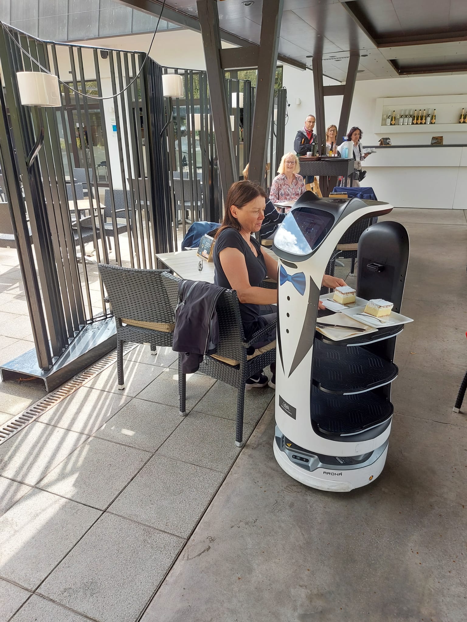 Sitten olikin aika lähteä ajelemaan kohti kisakylää Kranjska Goraa. Matkalla pysähdyimme Bledin kylään, joka on paljon suositumpi turistialue kuin Bohinj. Itse tykkäsin kuitenkin Bohinjin alueesta paljon enemmän juuri sen rauhallisuuden ja alkuperäisyyden takia. Bled-järven ympäristö on lähes kokonaan rakennettua ja siellä on paljon ravintoloita ja jokunen isompi hotelli. Ei Bledikään mikään iso paikka ole, mutta selvästi Bohinjia isompi ja vilkkaampi sekä turistimaisempi. Kävimme kahvilla ja syömässä Slovenialaisen herkun, kermakakun. Itsehän en kermavaahdosta tykkää, mutta kun sen kuori päältä pois, niin leivos oli oikein hyvä. Tutustuimme myös ravintolassa tarjoilevaan kissarobottiin. Kissa tarjoili ruoka-annokset ja vei likaiset astiat pois. Ja sanoi ”miau”.
