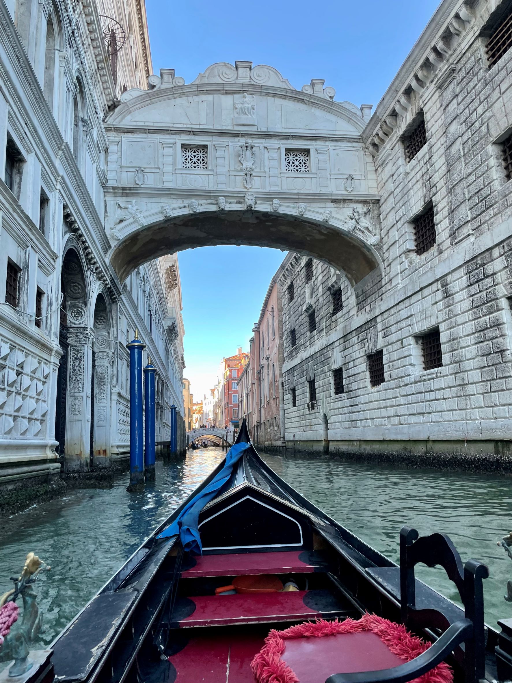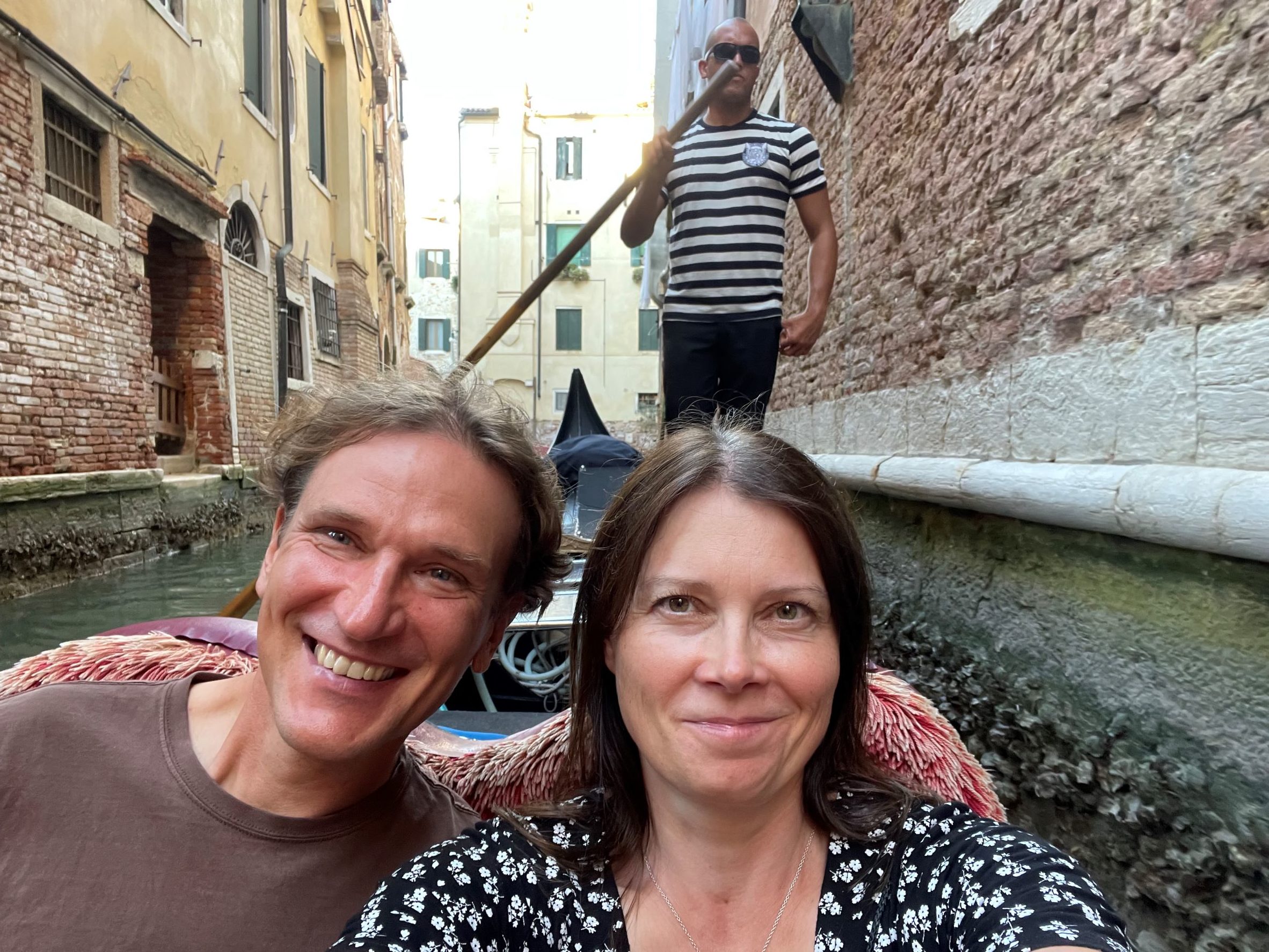 Kävimme hotellilla suihkussa ja loungessa nauttimassa pientä purtavaa ja Aperolia. Sen jälkeen palasimme kaupungille ja otimme gondoliajelun kapeita kanaaleja pitkin sekä Huokausten sillan alitse. Aivan loistava veneajelu. Maisemien lisäksi tuli seurattua myös gondolieerin melontataitoja sekä veneen ominaisuuksia. Venettä melotaan yhdellä melalla vain toiselta puolelta. Melan liike perustuu veneen kallistumiseen, jolloin se on mahdollista saada kulkemaan suoraan. Ei voi kuin ihailla gondolieerin taitoja kapeilla kanaaleilla, kuinka hän käänteli pitkää venettä tiukoissa mutkissa niin, ettei kylki kertaakaan raapaissut seiniä tai rakennusten kulmia. Tuntui hassulta lipua ihmisten kotien ohi, kun ovi oli suoraan vesirajan yläpuolella ja portaat veden alla. Moneen taloon pääsee kulkemaan vain vesiteitse, mutta suureen osaan on sisäänkäynti myös toiselta puolelta kuivalta maalta.