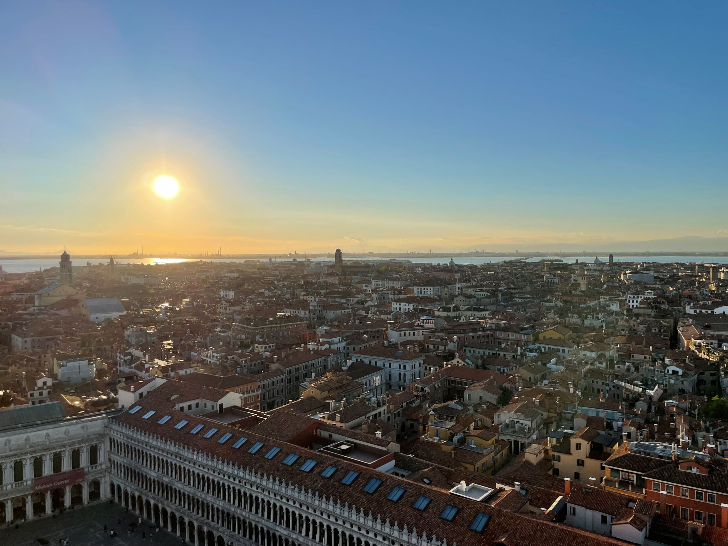 Pyörähdimme vielä San Marcon kellotornissa eli Campanile di San Marcossa. Ylhäältä oli upeat näkymät yli Venetsian kaupungin ja saarien auringon juuri laskiessa. Täältä suuntasimme syömään illallista kanaalin varteen rantaravintolaan. Ainakin tähän aikaan vuodesta pöydän sai helposti mistä tahansa ravintolasta ilman ennakkovarausta ja pöydänkin pystyi valitsemaan hyvin vapaasti. Venetsia oli kaiken kaikkiaan positiivinen kokemus, vaikka aluksi hiukan pelkäsin joutuvani täydelliseen turistimankeliin. Mutta tähän aikaan vuodesta turisteja ei ollut riesaksi asti. Rakennukset ovat kauniita, kanaaliverkosto ainutlaatuinen ja tunnelma jotenkin hmm… Venetsialainen. Lämmintä oli joka päivä 30 asteen kieppeillä, mutta sokkeloisessa kaupungissa rakennukset toivat varjoa pahimpaan paahteeseen.