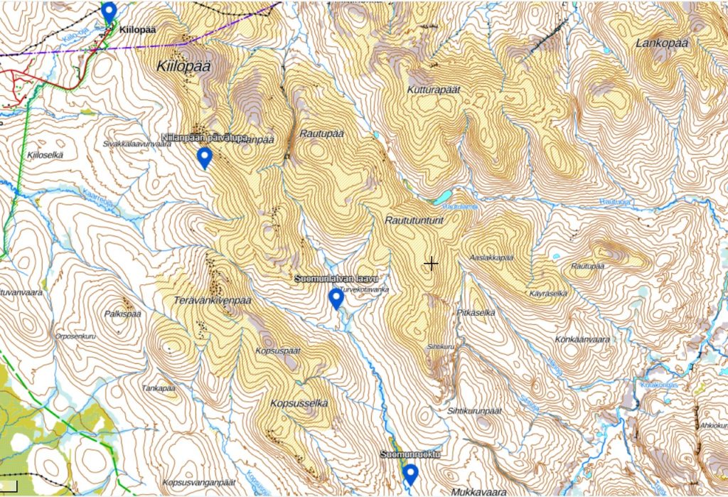 Sitten liikkeelle. Lähdimme Kiilopäältä runsaan aamiaisen jälkeen. Taivas oli kirkas, aurinko juuri nousemassa ja pakkasta -12 astetta. Ei tuullut. Varsin kaunis aamu. Reitti lähtee heti nousemaan tunturiin ja kulkee aluksi muutamia satoja metrejä ajettua hiihtolatua pitkin, ennen kuin kääntyy kelkalla ajetulle polulle. Ensimmäiset 5 kilometriä seurasimme tätä kelkkauraa, jonka jälkeen käännyimme kohti polutonta tunturimaastoa. UKK puistossa ei ole tuon alun pätkän jälkeen minkäänlaisia merkittyjä reittejä, vaan hiihtämään joutuu kartan, kompassin ja oman suunnistustaidon varassa. Meillä oli myös gps paikannin mukana huonon sään varalta.