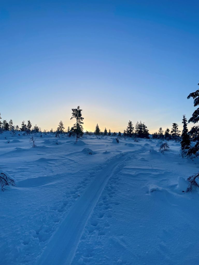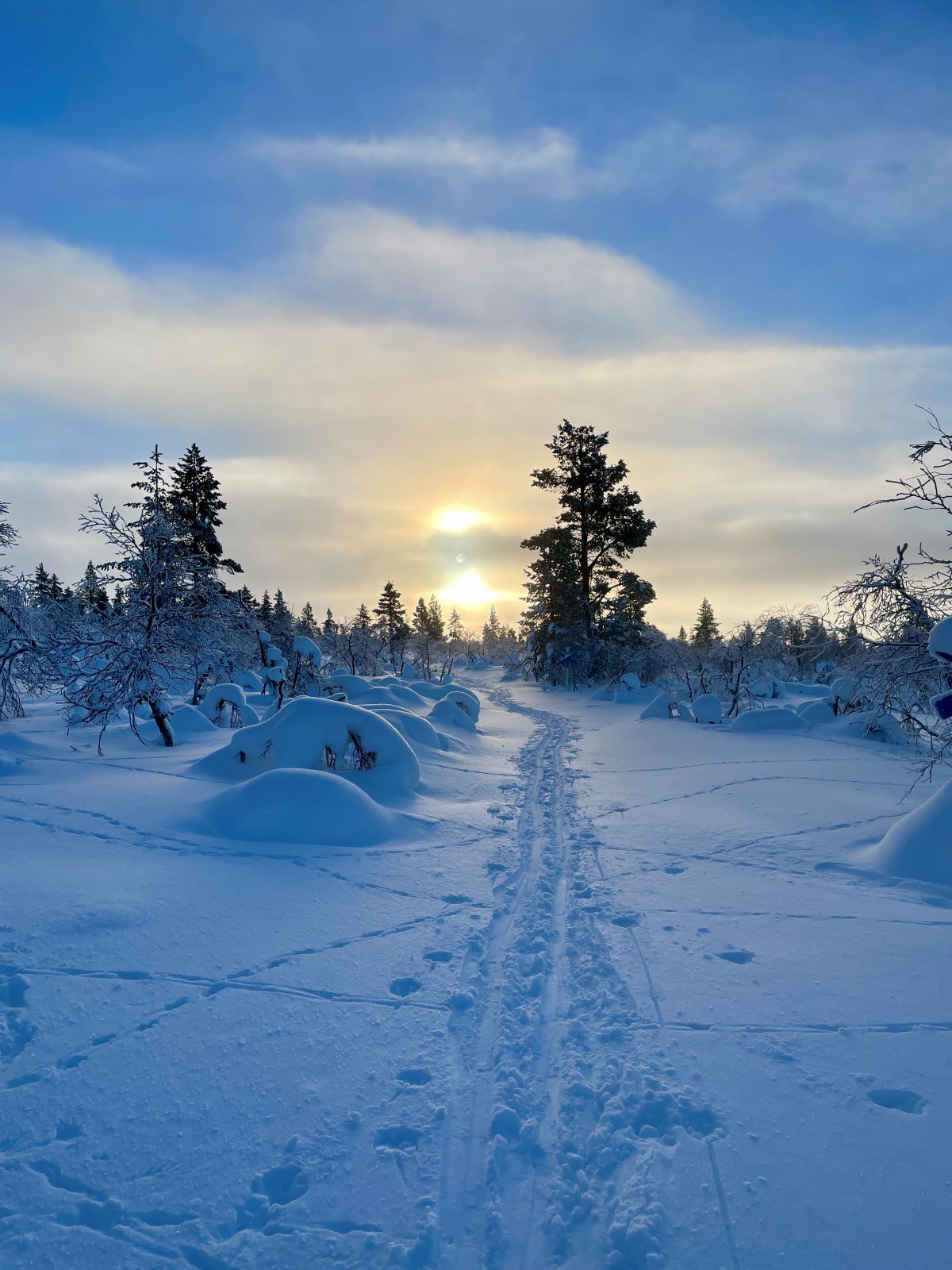 Tämän talven hiihtovaellukselle päädyimme toistamiseen Urho Kekkosen kansallispuiston syrjävyöhykkeelle. Hiihdimme täällä myös viime talvena kaamosaikaan, mutta silloin eteneminen oli syvän lumen takia todella hidasta ja päivämatkatkin jäivät useampana päivänä aika lyhyiksi, vaikka ajallisesti päivät venyivätkin pitkiksi. Lunta oli tänäkin talvena paljon, jopa enemmän kuin viime vuonna, mutta nyt alueella oli liikkunut huoltokelkkoja ja muita kulkijoita sen verran, että monessa kohtaa oli lumen alla kuitenkin kova pohja, eikä lumi upottanut ihan niin pahasti. Paitsi jos poikkesi umpihangen puolelle. Silloin saattoi humpsahtaa hankeen takamusta myöten.