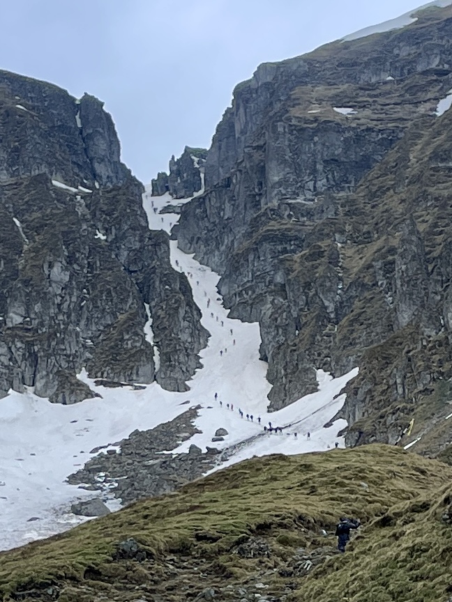 Aluksi nousu oli kohtuullista, kunnes pääsimme harjanteen päälle ja kaukana edessä näkyi Hornul ”hornanpiippu”. Hornul tarkoittaa Romaniaksi savupiippua ja itse kutsuin sitä hornanpiipuksi. Se oli erittäin jyrkkä luminen kuru, joka nousi kahden jyrkänteen välistä melkein pystysuoraan ylös. Vaikuttava näky! Valitettavasti valokuvat eivät tee oikeutta kurun jylhyydelle. Lumeen oli muodostunut askelmat, jotka muistuttivat tikkaita. Niitä ja sauvoja hyödyntäen pääsi nousemaan hyvin. Tässä kohdassa monet olivat aika paniikissa. Osa hoki paniikinomaisia lauseita kuten ”I’m afraid, I’m afraid”, osa itki. Alaspäin ei tehnyt mieli katsoa, kun tuntui että heti alkoi tasapaino horjumaan. Jos tässä nousussa jonkun jalka olisi livennyt askelmilta, niin hän olisi luultavasti vyörynyt alas asti ja keilannut muut mennessään. Kaikesta huolimatta tämä oli yksi reitin parhaita osuuksia.