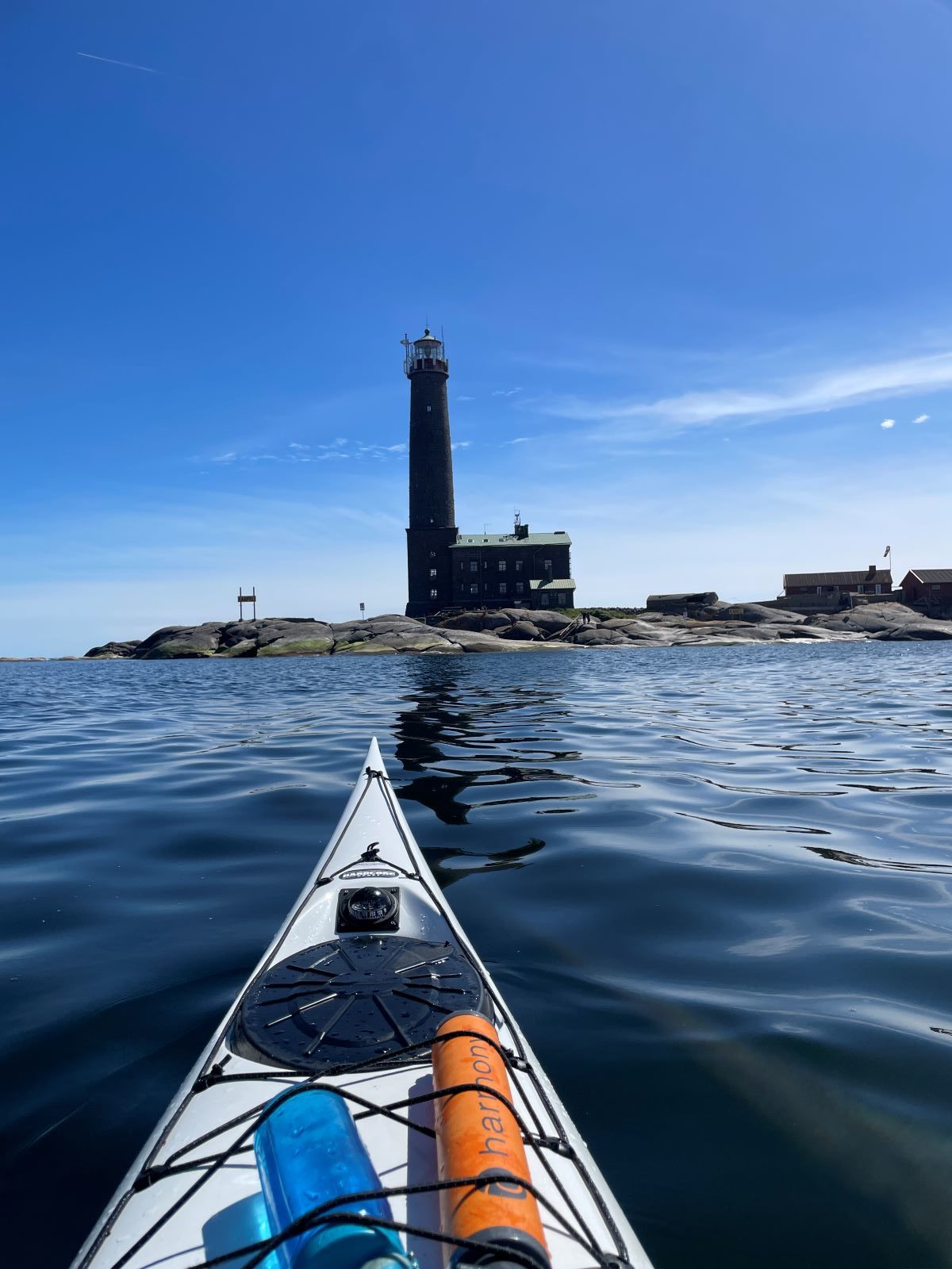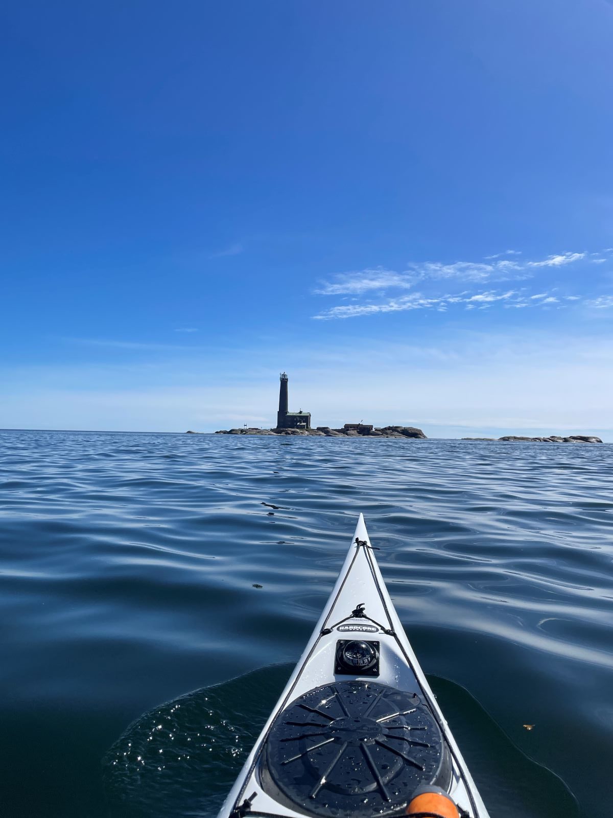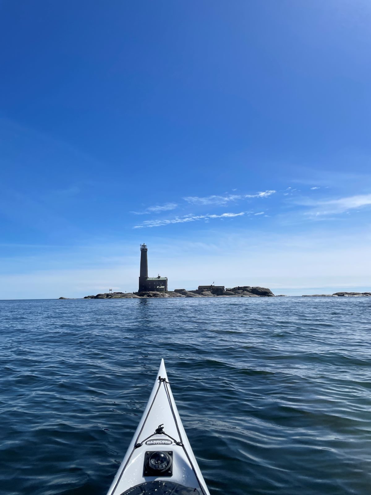 Alkuperäisen suunnitelman mukaan olisimme meloneet Bengtskärille sunnuntaina, mutta lauantaina oli tosiaan niin tyyntä ja kaikin puolin hieno sää, että päätimme lähteä kohti Bengtskäriä kevyen lounaan jälkeen. Pakkasimme kajakit ja lähdimme melomaan n. 15 km etappia, josta n. 10 km on avomerellä. Alkuun puikkelehdimme saarten kapeista väleistä ja ihailimme taivaalla lentävää merikotkaa. Se lensi niin läheltä, että kynnetkin pystyi laskemaan, mutta harmillisesti puhelimen esiin kaivamisessa kestää aina niin kauan, että kunnon kuvaa siitä ei ehtinyt saamaan.