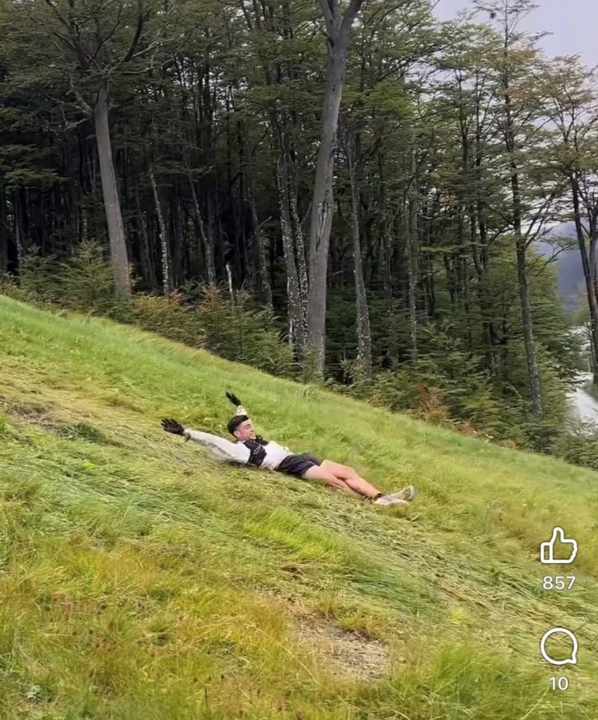 Viimeinen huolto oli heti vuorelta alas tullessa Fin del Mundossa. Loppumatka olikin sitten joen vartta melko tasaista tai jopa loivaa alamäkeä, mutta hyvin soista ja upottavaa. Todella raskasta. Joen ylitimme taas kahlaamalla useamman kerran. Yksi ylityksistä oli vähän leveämpi ja syvempi ja kaivoin puhelinta jo valmiiksi taskusta, ajatuksena, että saisi edes yhdestä ylityksestä kuvan. Puhelinta räplätessä astuin hiukan reitiltä sivuun ja humpsahdin jokeen vyötäröä myöten. Samalla puhelin lensi kädestä. Se päätyi onneksi mutaiselle joentörmälle, josta sain sen nopeasti napattua, ennen kuin se valui jokeen. Hyvä tuuri, sillä tuosta virtaavasta joesta sitä tuskin olisi enää löytänyt. No, tulipahan ainakin kengät ja vaatteet huuhdeltua savesta ja suoturpeesta.