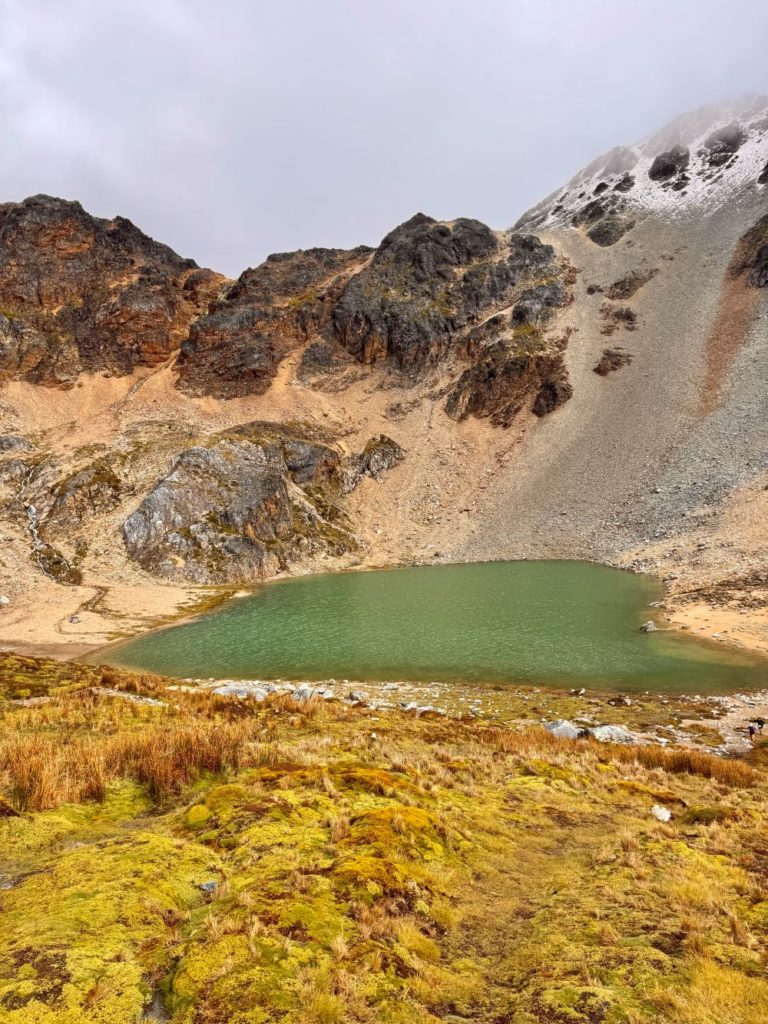 Aika pian huollon jälkeen lähdettiin toiseen isompaan nousuun. Tällä pätkällä oli vuorten keskellä kaksi lagunaa, joista ensimmäinen, Laguna Turquesa oli todella upea. Pidettiin ylämäessä tasaista vauhtia ja ohitettiin monia. Yleensä olen itse tientukkeena ylämäissä ja ohittelen alamäissä, mutta täällä tuntui olevan paljon hötkyilijöitä. Eli heitä, jotka spurttaavat kovalla vauhdilla ylöspäin muutaman kymmenen metriä ja jäävät sitten polun varteen puuskuttamaan ja nojailemaan sauvoihin. Se harvemmin on tehokkaampi taktiikka kuin tasainen ja rauhallinen yhtäjaksoinen eteneminen.