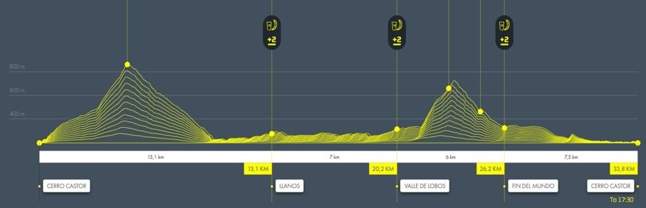 Lähdin liikkeelle pitkähihaisessa paidassa, jonka päälle laitoin Sambapaidan lähinnä koristeeksi ja päälle vielä Sambatakin. Reitti lähtee suoraan nousemaan ylös Cerro Castorin laskettelurinteen päälle. Aika nopeasti sai Sambatakin riisua. Alusta oli enimmäkseen hiekkatietä. Sellaista laskettelurinteen huoltotietä, jossa eteneminen oli helppoa. Mutta samanlaista hiekkatietä tultiin sitten toiselta puolelta alas ja kävi juuri niin kuin pelkäsinkin; sain etureidet juoksemalla kipeäksi ensimmäistä kertaa elämässäni. Treenit, etenkin mäkitreeni ja pitkät lenkit ovat jääneet olemattomiin viime syksyn Monte Rosan kisan jälkeen ja se kostautui nyt tällaisessa hyvin juostavassa alamäessä pahasti. Alamäkeä oli useita kilometrejä ja se oli tosiaan hyvin juostavaa. Ja mehän juostiin alas vauhdilla, joka sai etureidet todella jumiin. Hiukan ennen huoltoa ylitettiin vuolaasti virtaava joki kahlaamalla. Vesi ylettyi joen keskellä puoleen reiteen ja virta oli aika voimakas. Tässä sai tehdä ihan töitä yli päästäkseen. Pienempiä joen ylityksiä tulisi vastaan vielä useita ja yksi vielä vähän syvempi, mutta siitä myöhemmin.